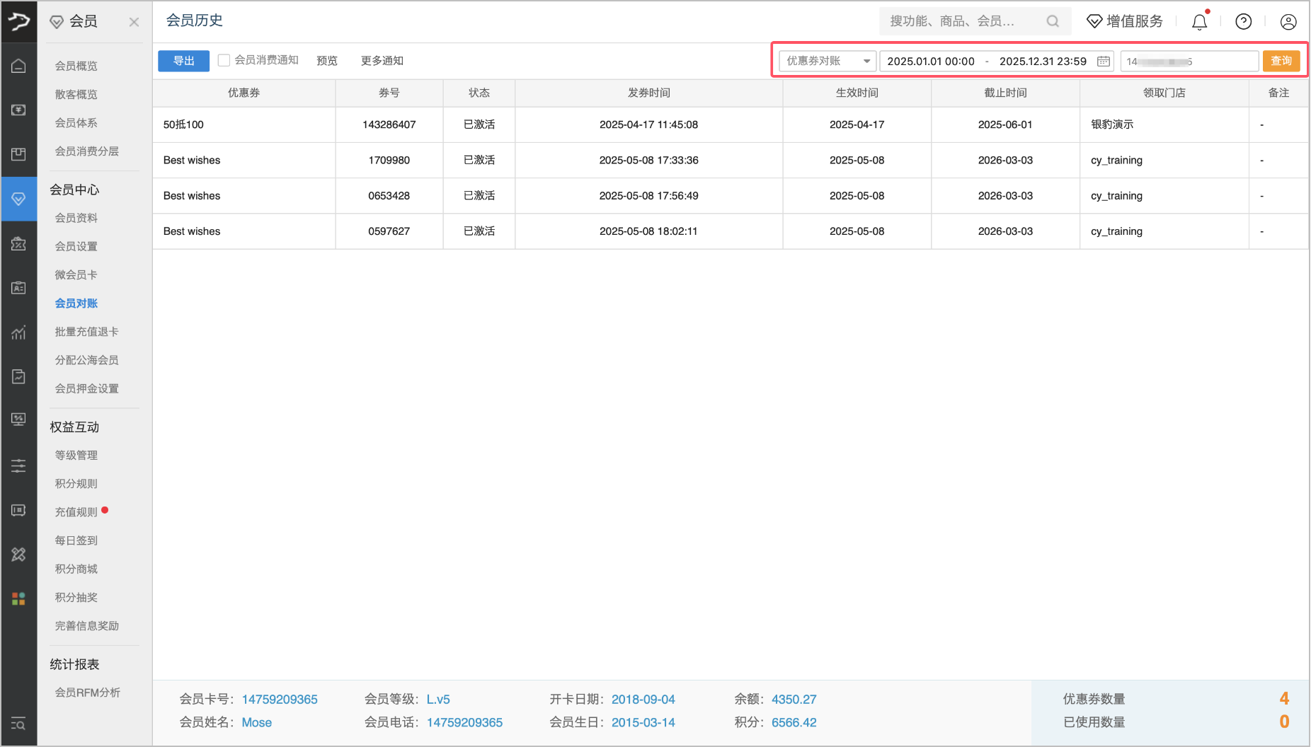 应用场景:查询时间范围内会员的所有优惠券(含状态、有效期等),用于核对优惠券的持有数量、已使用数量等实际使用情况。