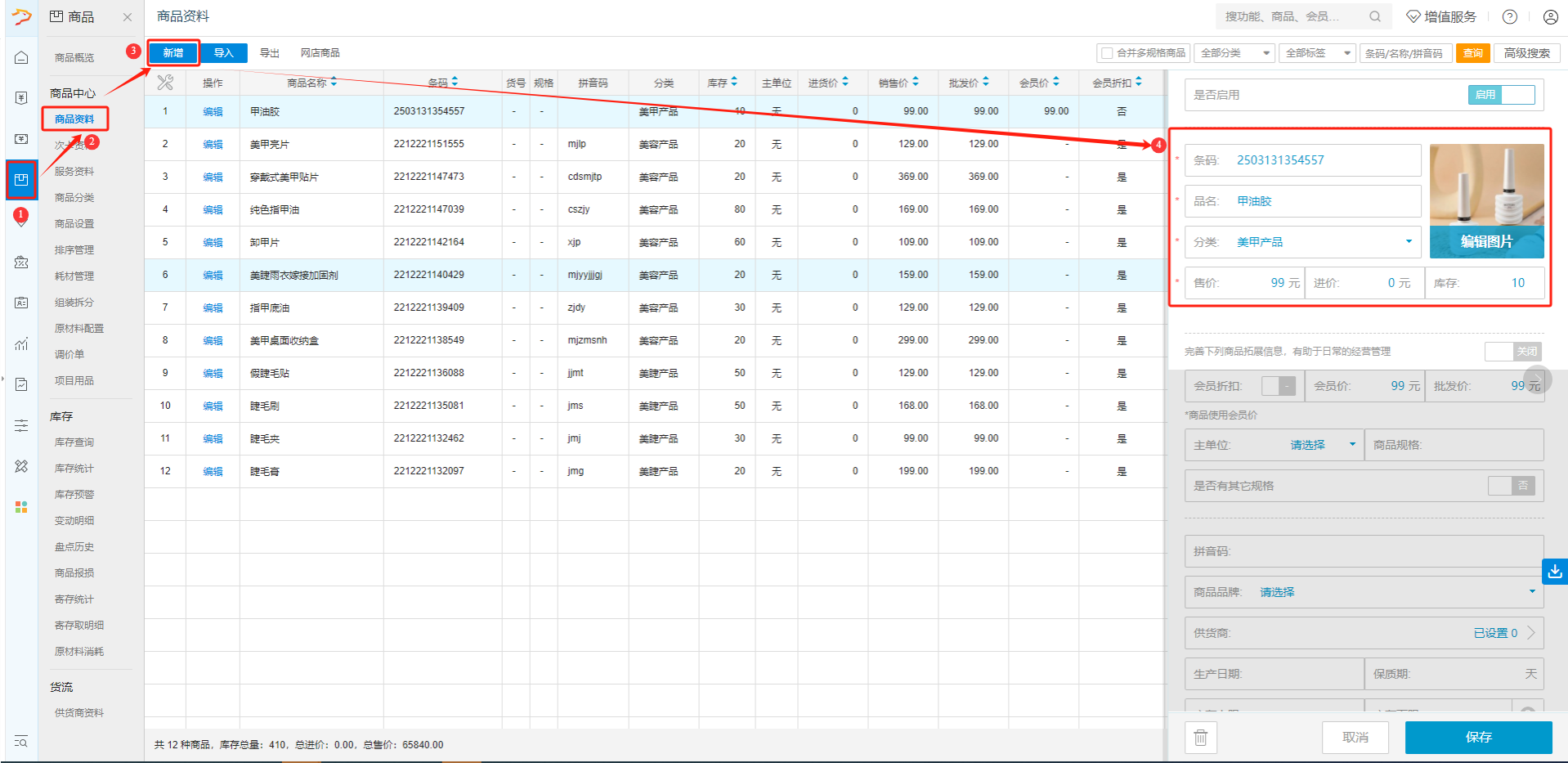 操作步骤:云后台点击【商品】—【商品资料】—左上角点击【新增】按钮,填入基本信息后保存输入所有必填项,商品条码可自动生成或手动输入。(带*为必填项)