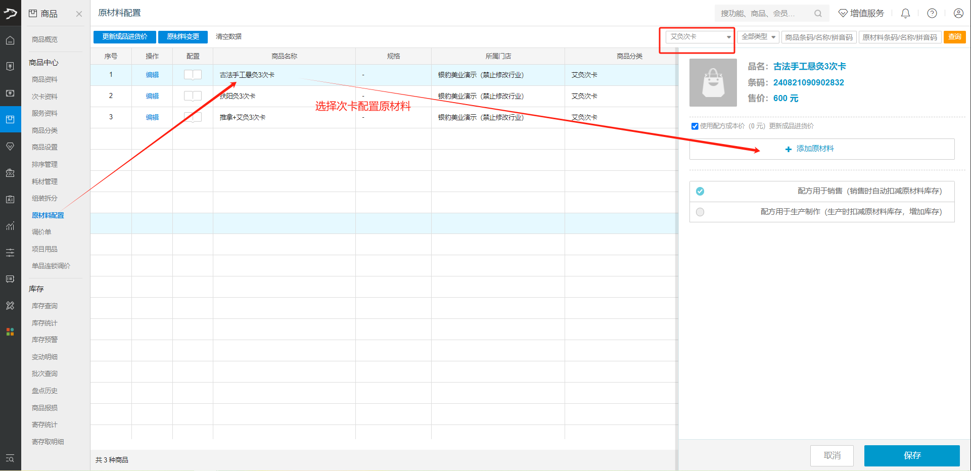 操作步骤:云后台点击【商品】—【原材料配置】—【编辑】—【添加原材料】,找到次卡绑定的服务项目,绑定面膜等客装商品