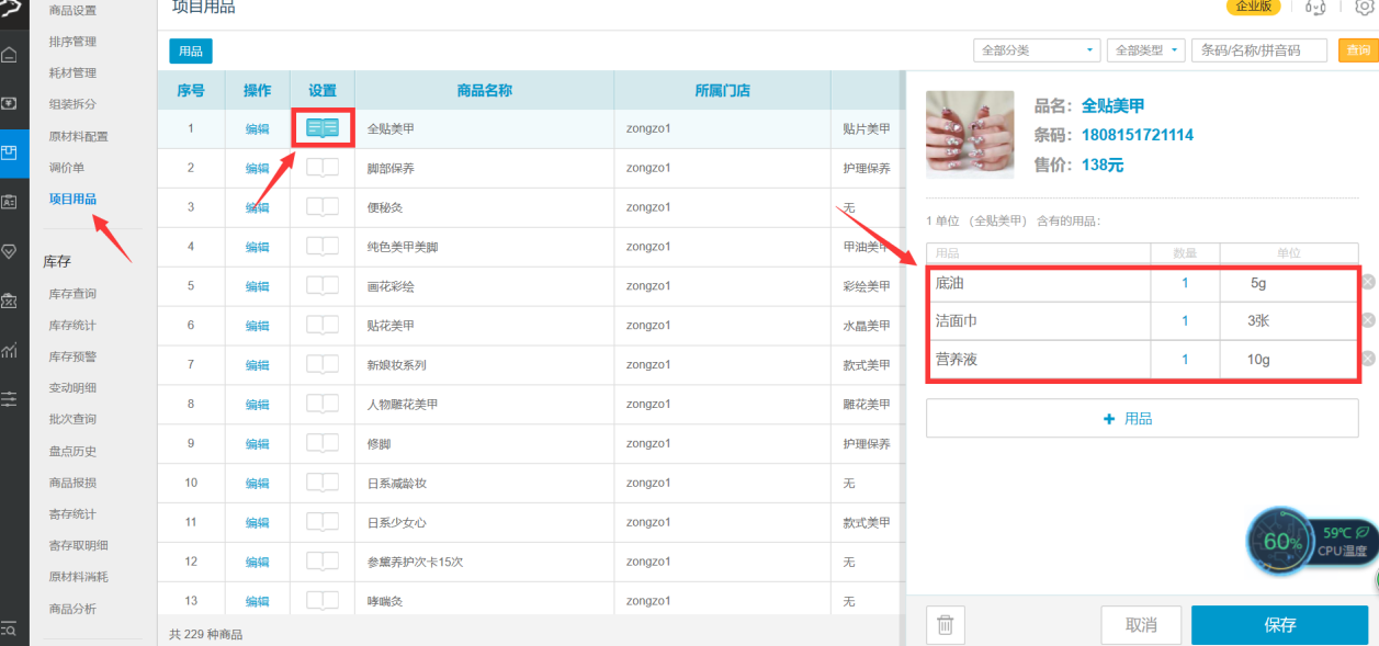 项目用品定义:美业门店给顾客做服务项目时,罗列服务相关器材和用品详细名称,在收银小票上打印相关用品信息(如营养成本),不会扣减库存。