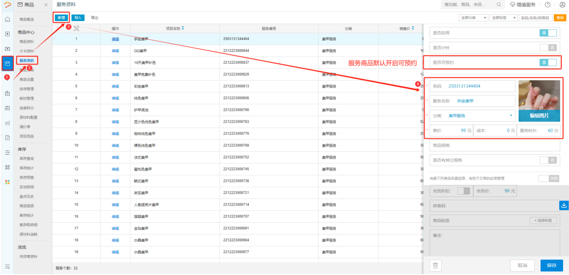 操作步骤:云后台点击【商品】—【服务资料】—左上角点击【新增】按钮,填入基本信息后保存输入所有必填项,商品条码可自动生成或手动输入。(带*为必填项)