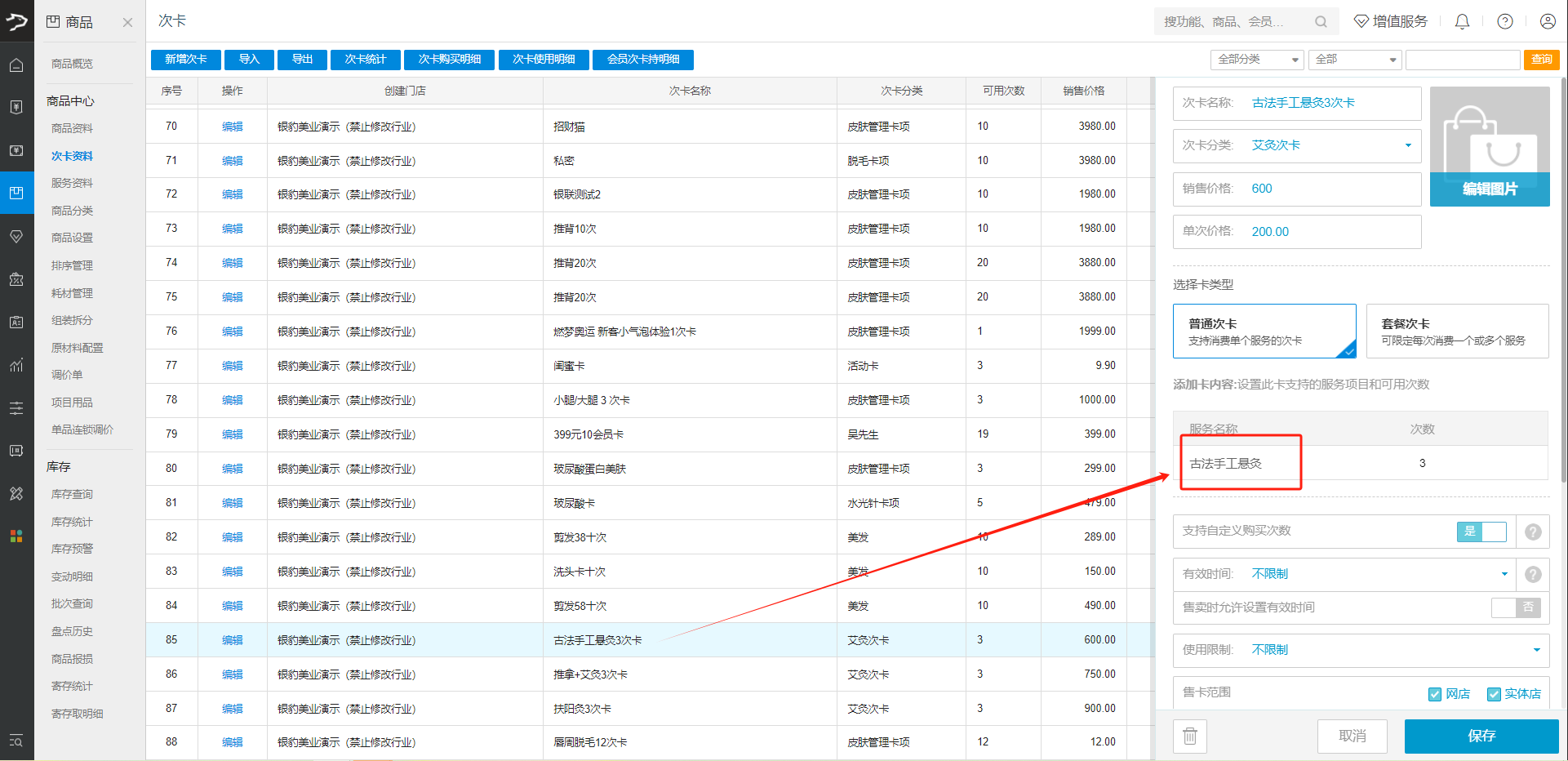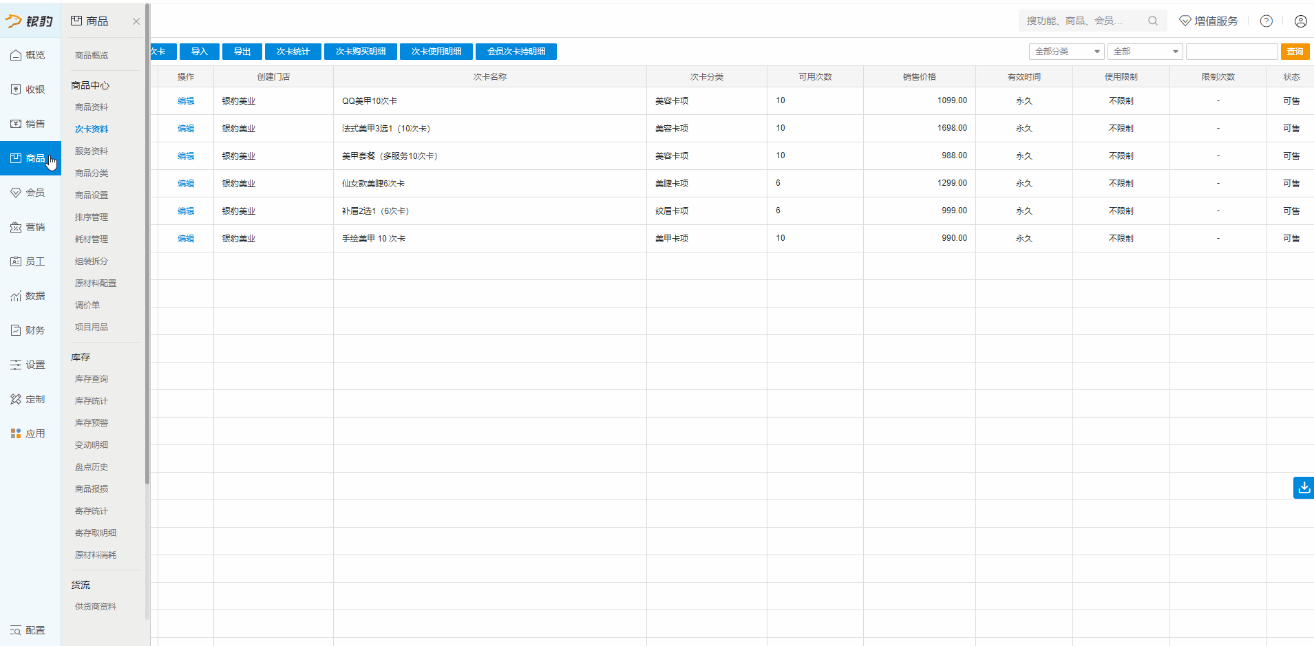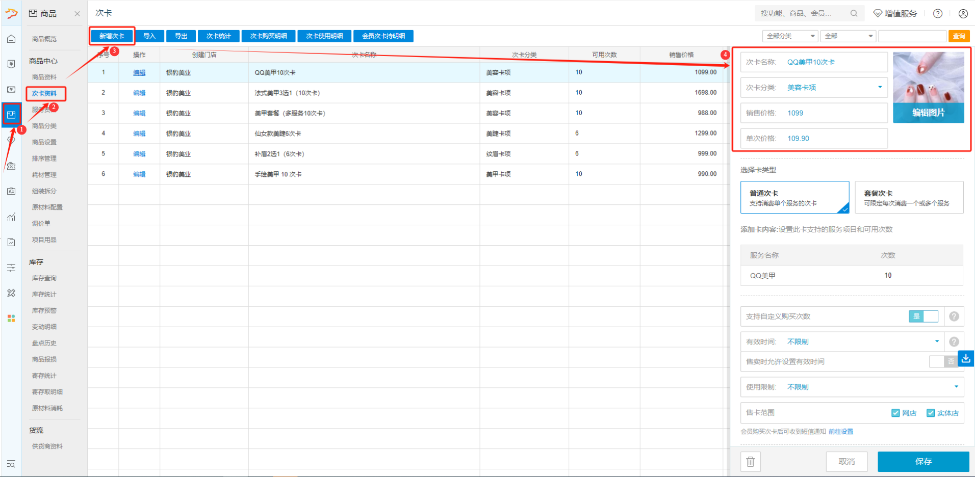 操作步骤:云后台点击【商品】—【次卡资料】—左上角点击【新增次卡】(默认开启计次,输入次卡名称等信息,注意:次卡名称要有次数,如:美嫩肤卡10次)