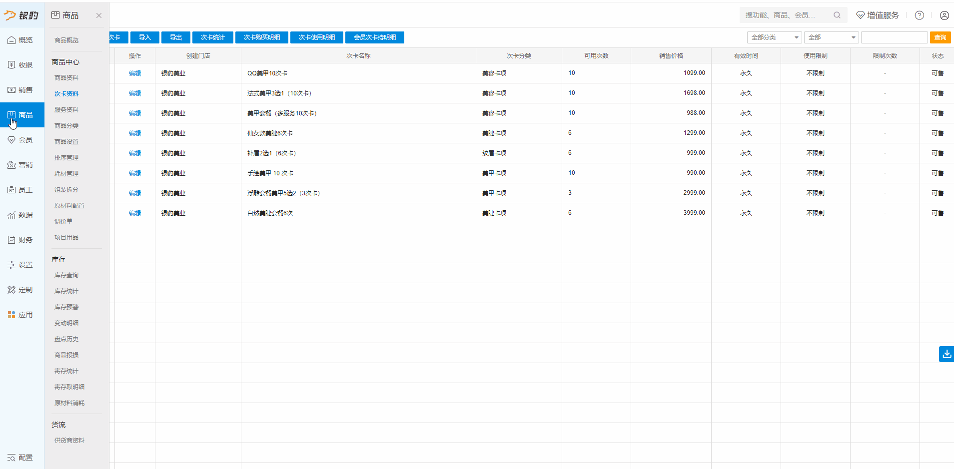 操作步骤:云后台点击【商品】—【次卡资料】—左上角点击【新增次卡】,是否计次选择【否】,正常添加服务项目,两个以上项目不限次选择套餐次卡添加,填写有效时间(如月卡30天,季卡90天,年卡365天)