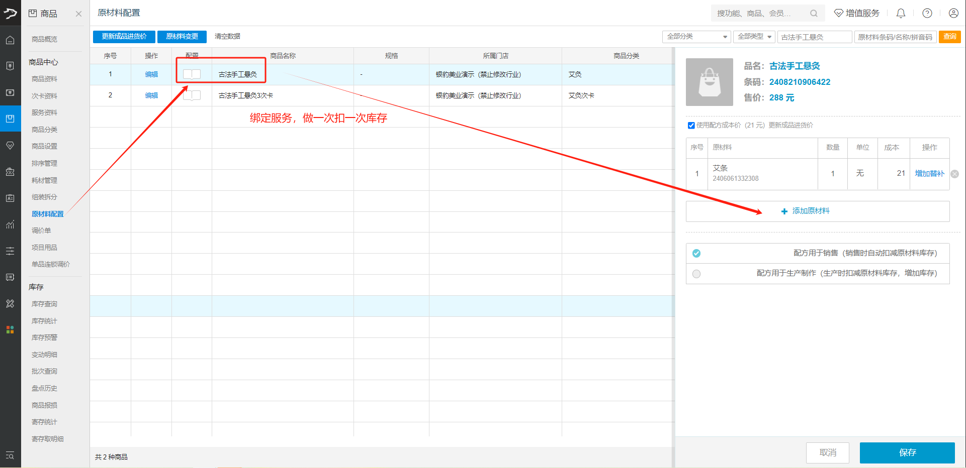 服务项目绑定原材料,顾客来划卡一次,扣减一次商品库存