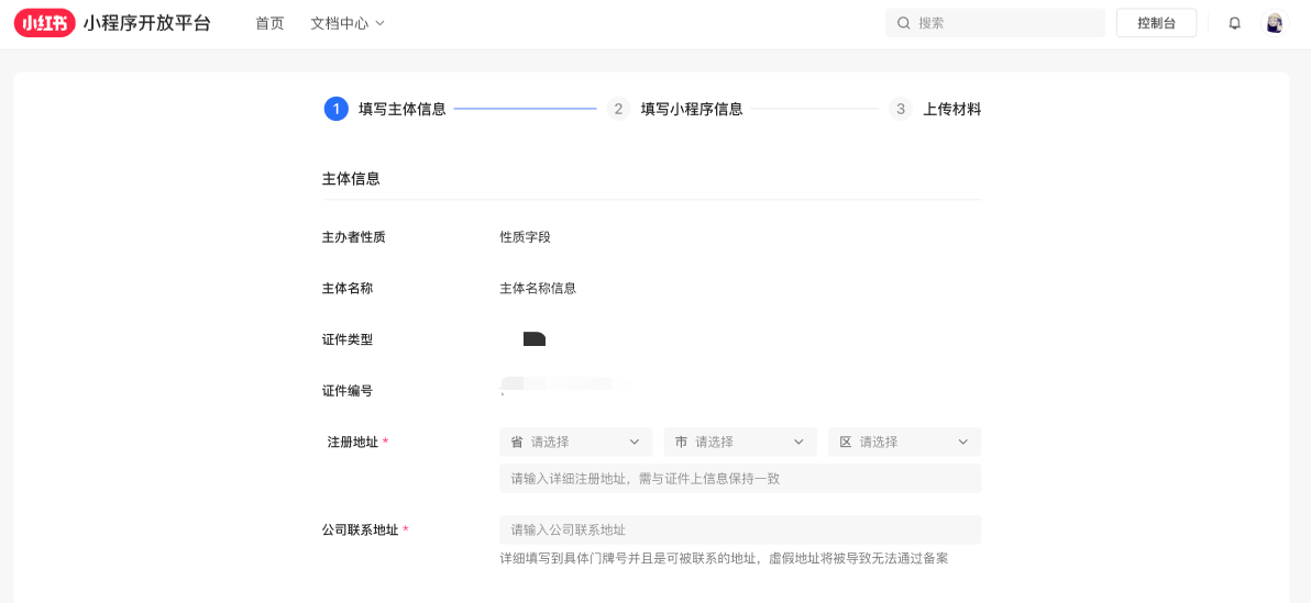 - 选择注册地区后(包含:省、市、区),注册地址请填写包含省市区的完整的实际公司联系地址(地址需要可被联系);