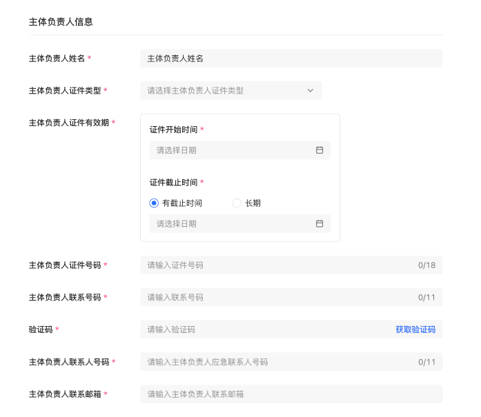 - 手机号码请填写主体负责人、应急联系人本人使用的有效手机号码,需保持电话畅通,不同人不能使用同一个号码。
