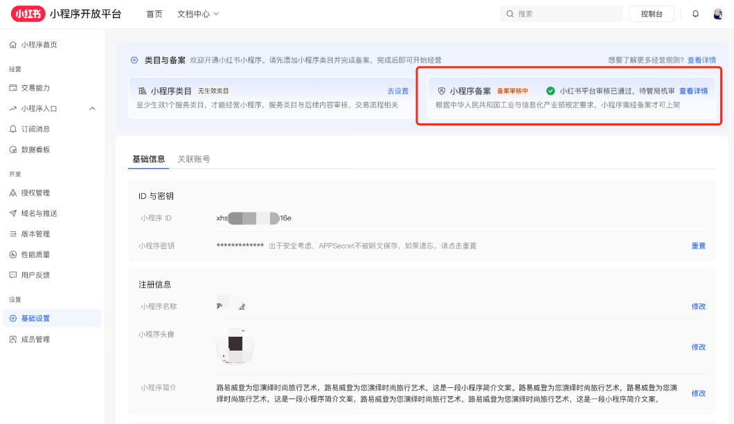 开发者在小红书小程序平台提交小程序备案信息后,平台将会在1-2个工作日内完成初审(具体请以实际审核时间为准),审核结果将以站内信、模板消息等形式通知管理员。 在平台初审的过程中,请备案相关人员保持电话畅通,以便平台对你提交的备案信息进行核验。
