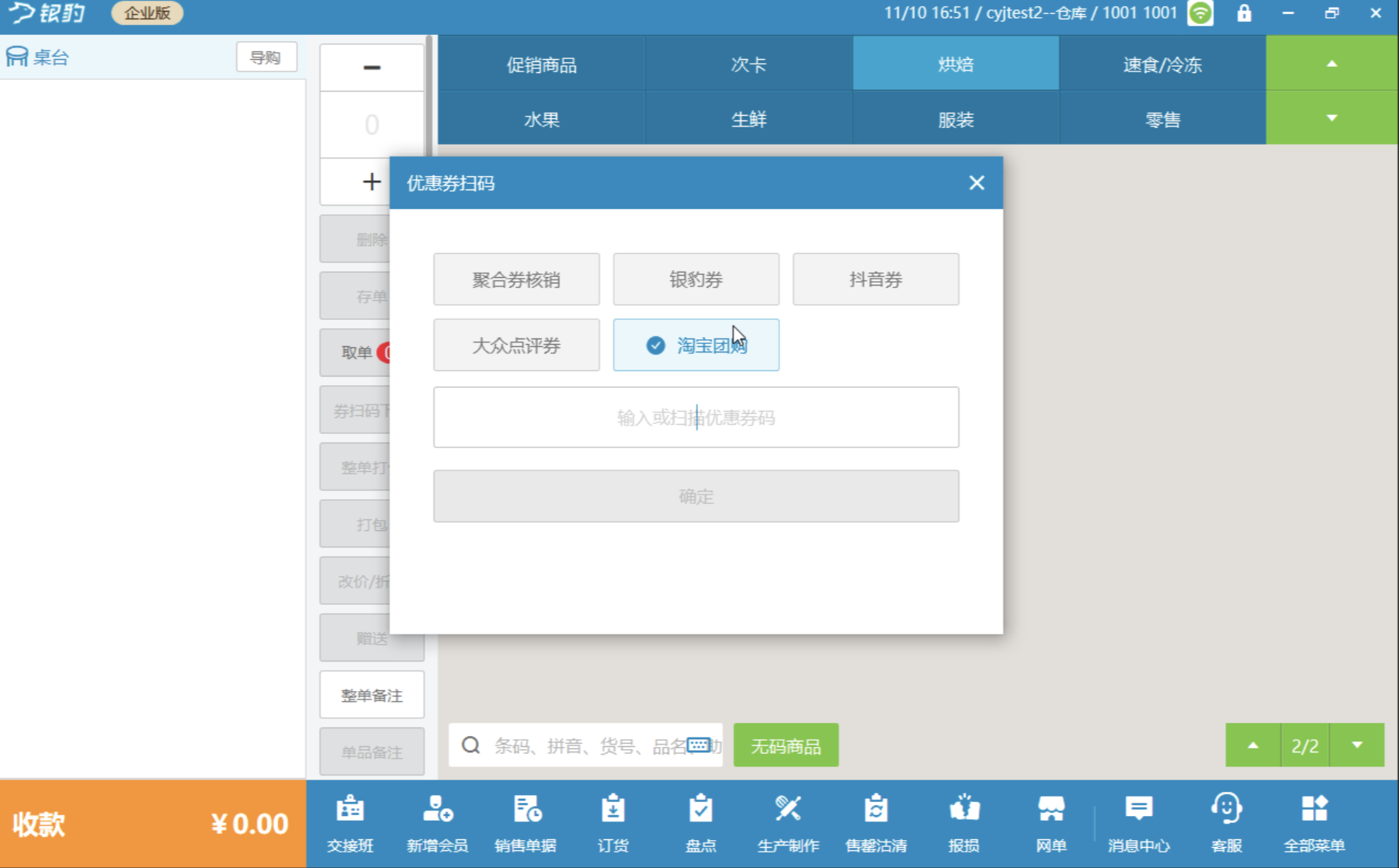 点击【券扫码下单】-【淘宝团购】(目前暂不支持聚合券核销,后续将更新支持。) - 扫描顾客的淘宝闪购团购的套餐劵券码,即会将云端设置的对应团购活动关联的核销数量的单品/套餐自动加入购物车,点击收款-确定后,即可自动核销淘宝闪购团购券