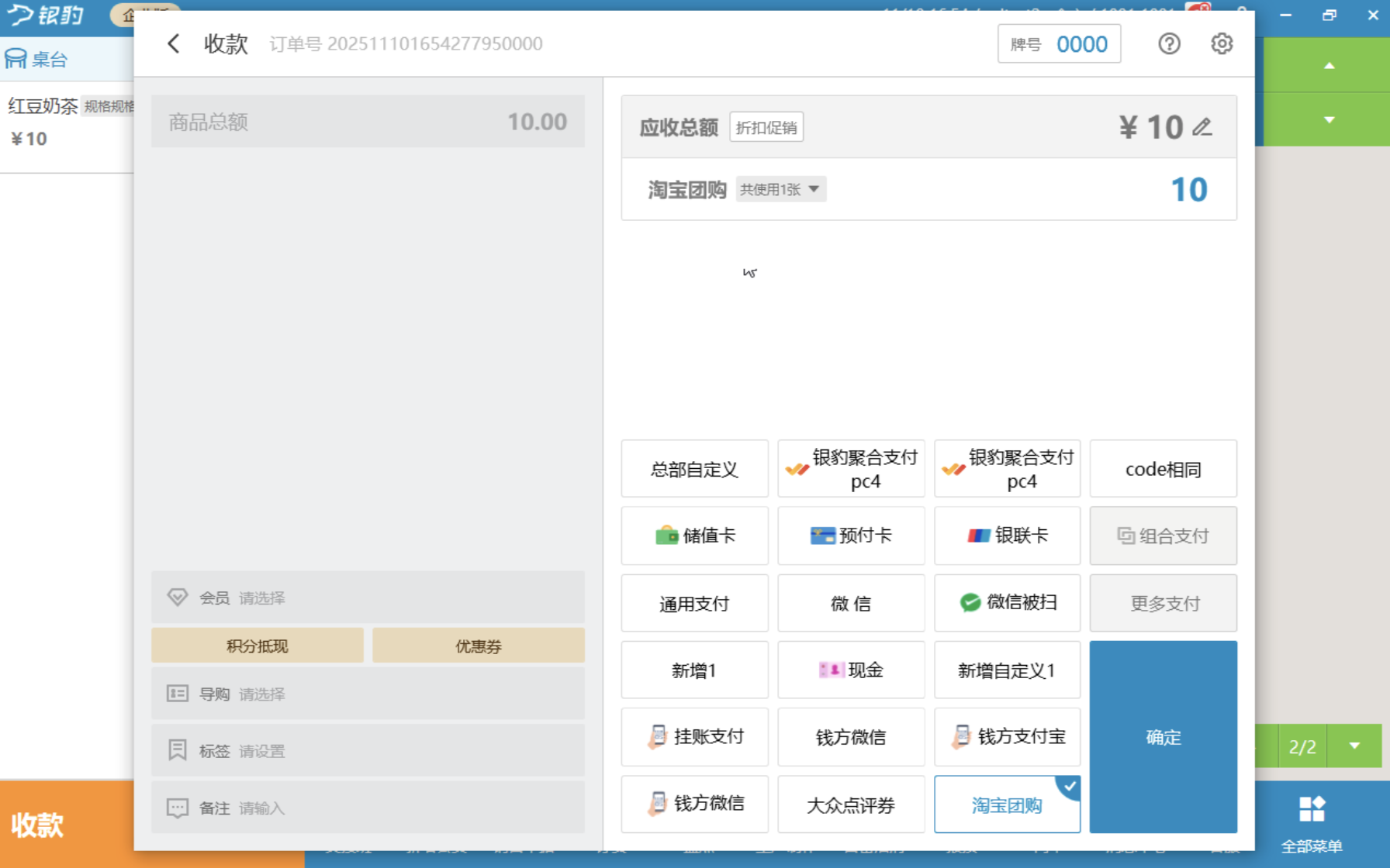 对于代金券或者套餐券,可以先点商品到购物车后点击收款,支付方式选择【淘宝团购】,扫码顾客的团购券码后,系统将自动进行订单金额的计算抵扣,订单收银完成时,顾客的团购券将被核销。