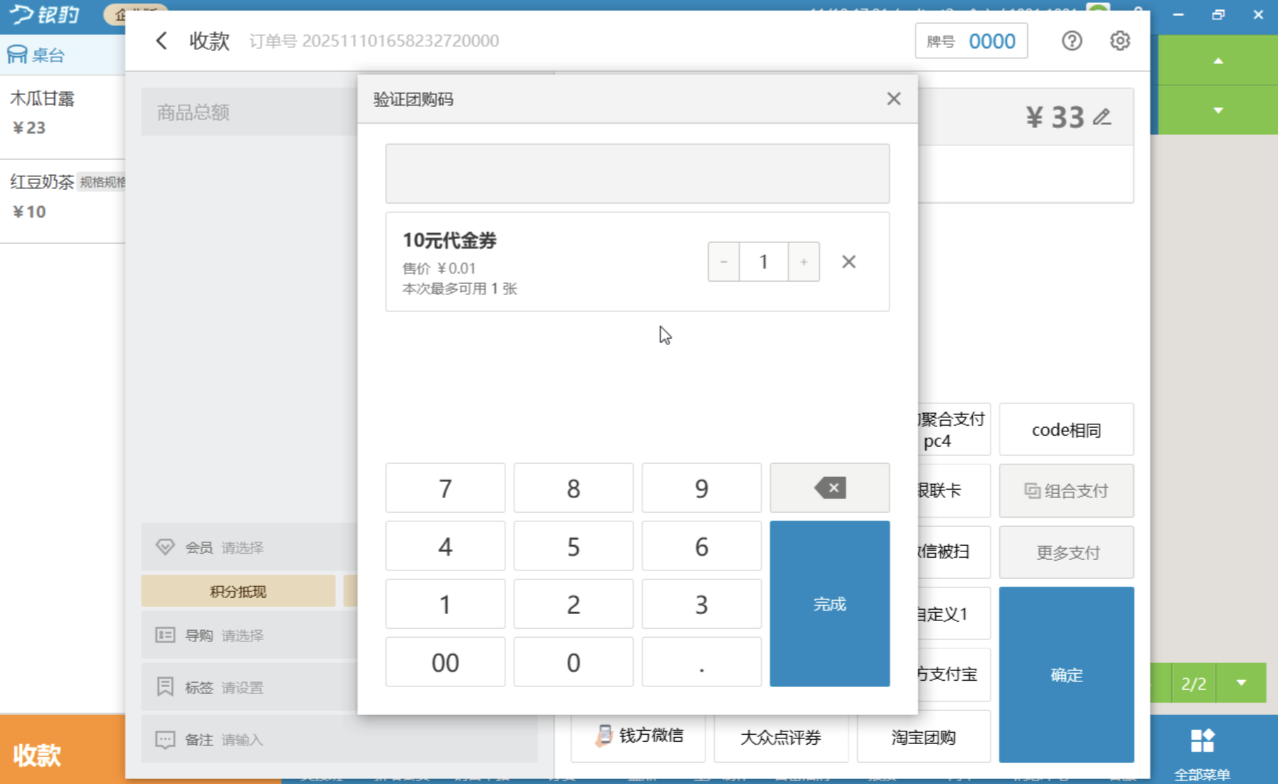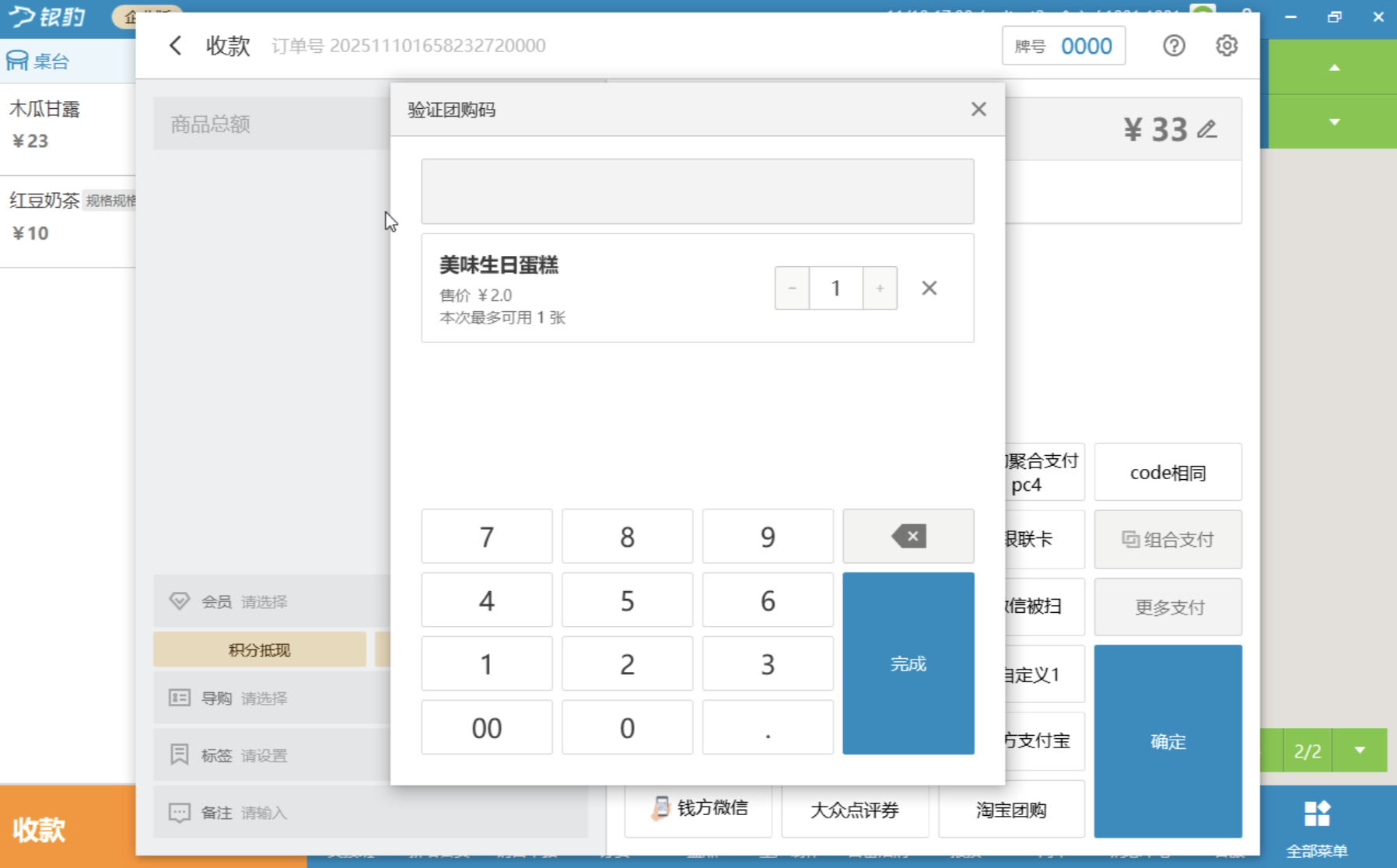收银完成后,云端销售单据可查看入账的金额和核销的团购券券码