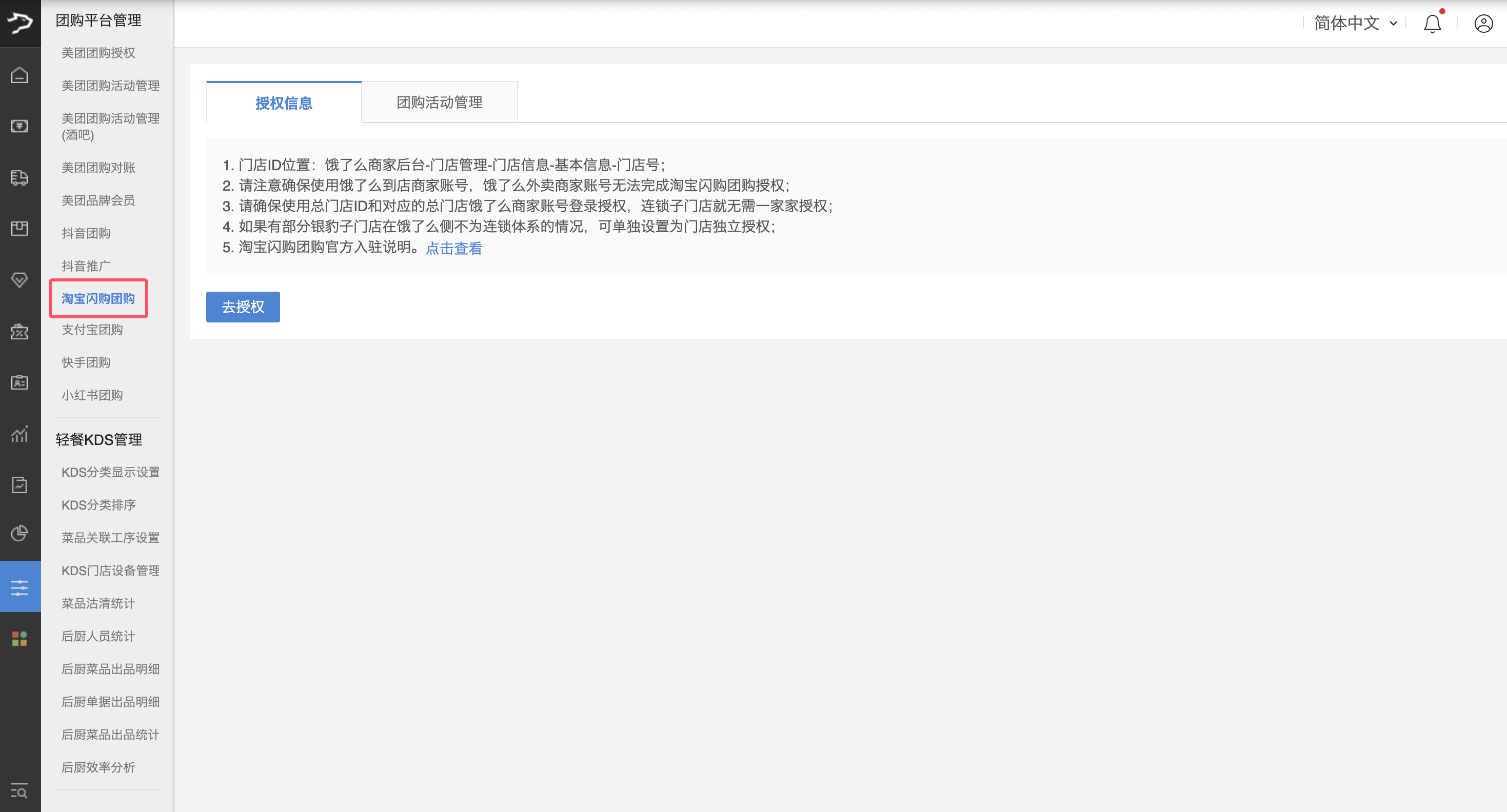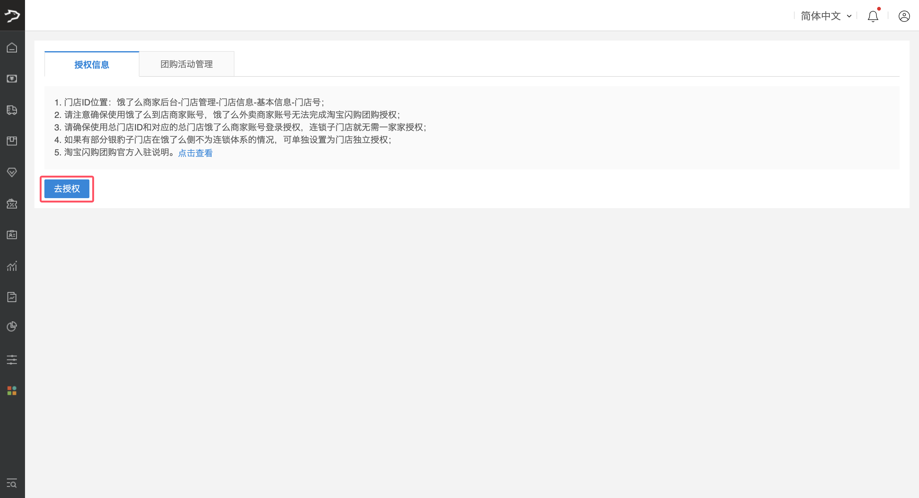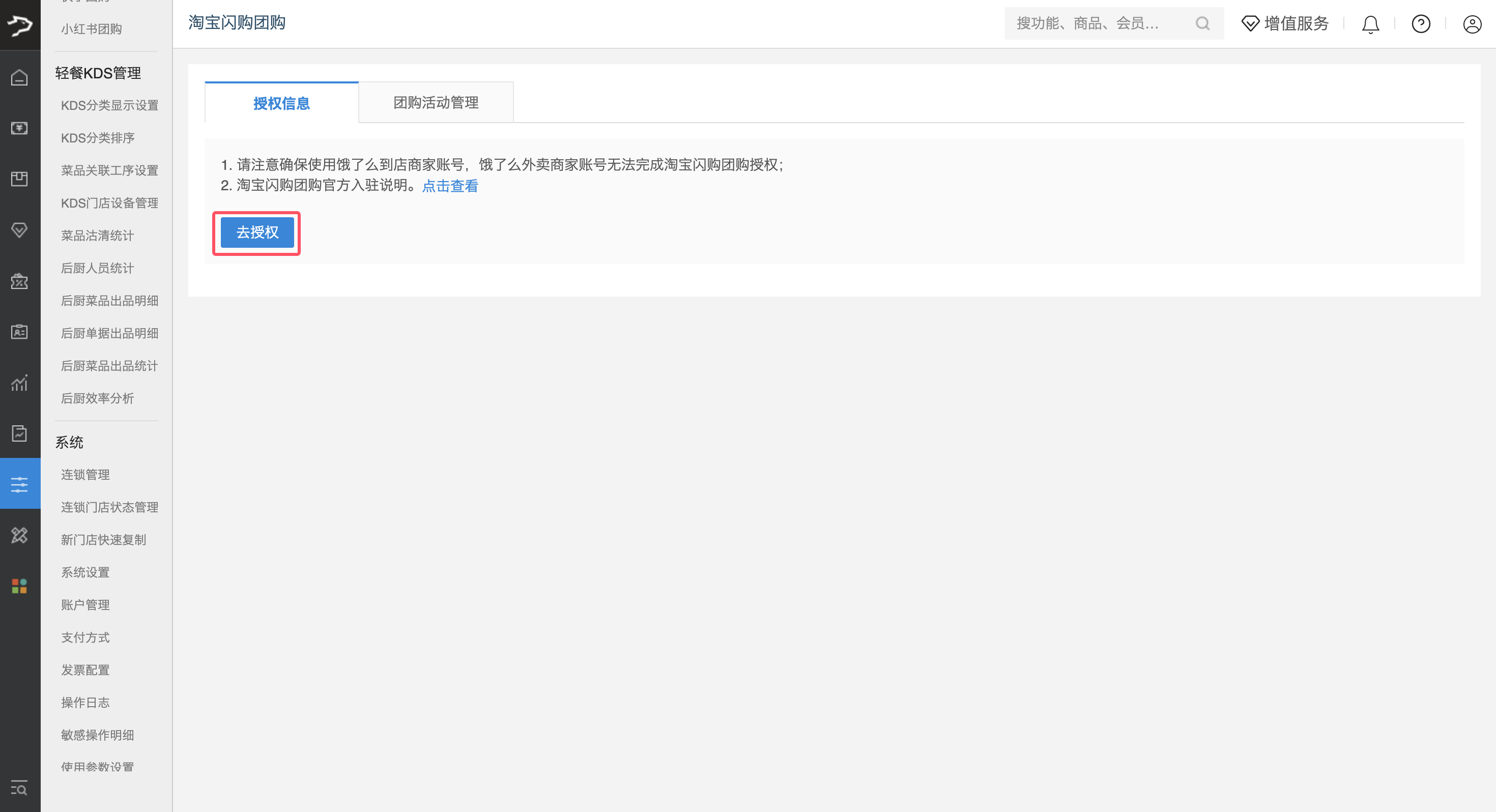 1、总部账号登录银豹后台,进入【淘宝闪购团购】页面的【授权信息】标签页,点击【去授权】。