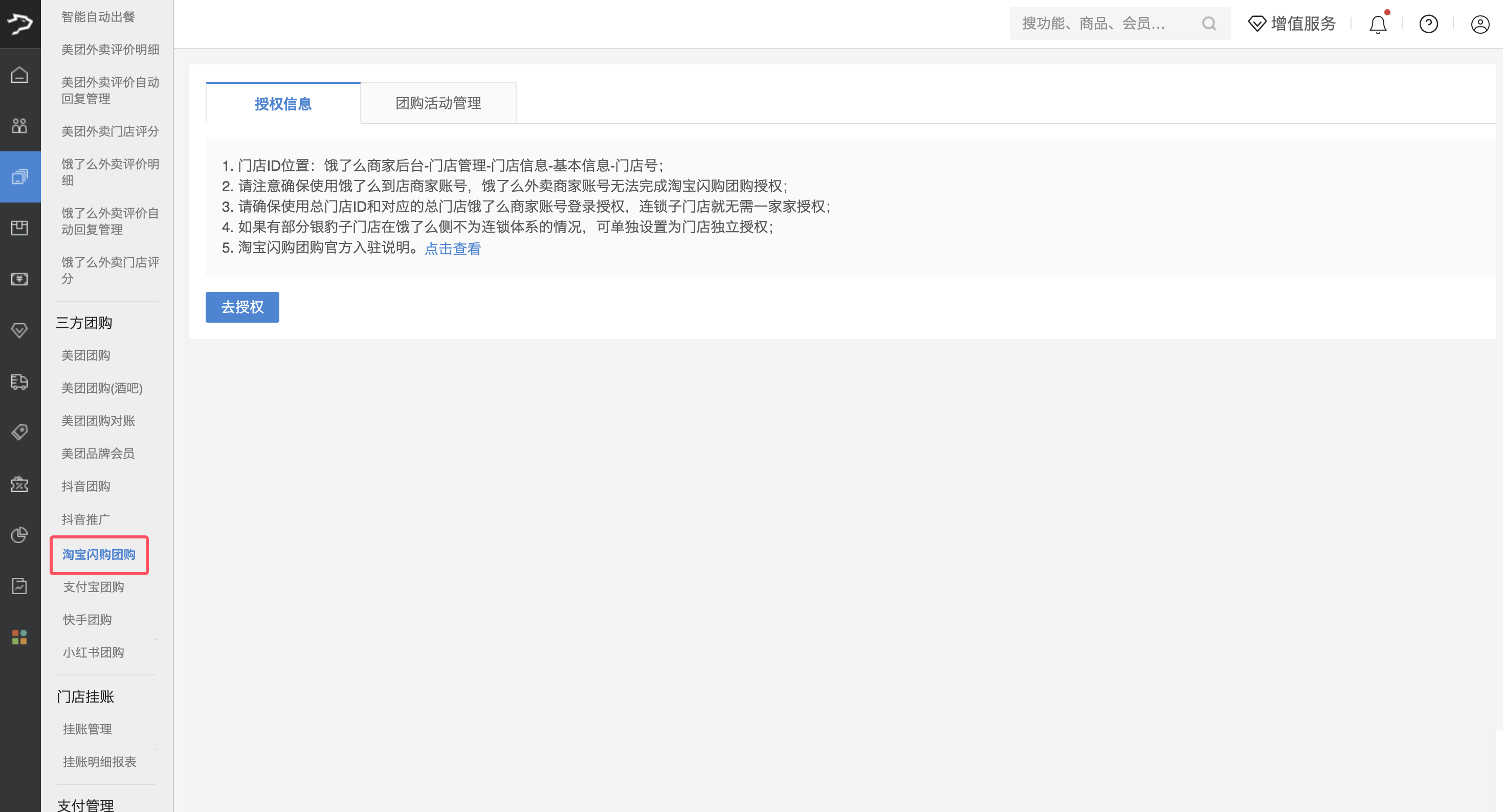 1、登录银豹后台,进入【淘宝闪购团购】页面的【授权信息】标签页,点击【去授权】。