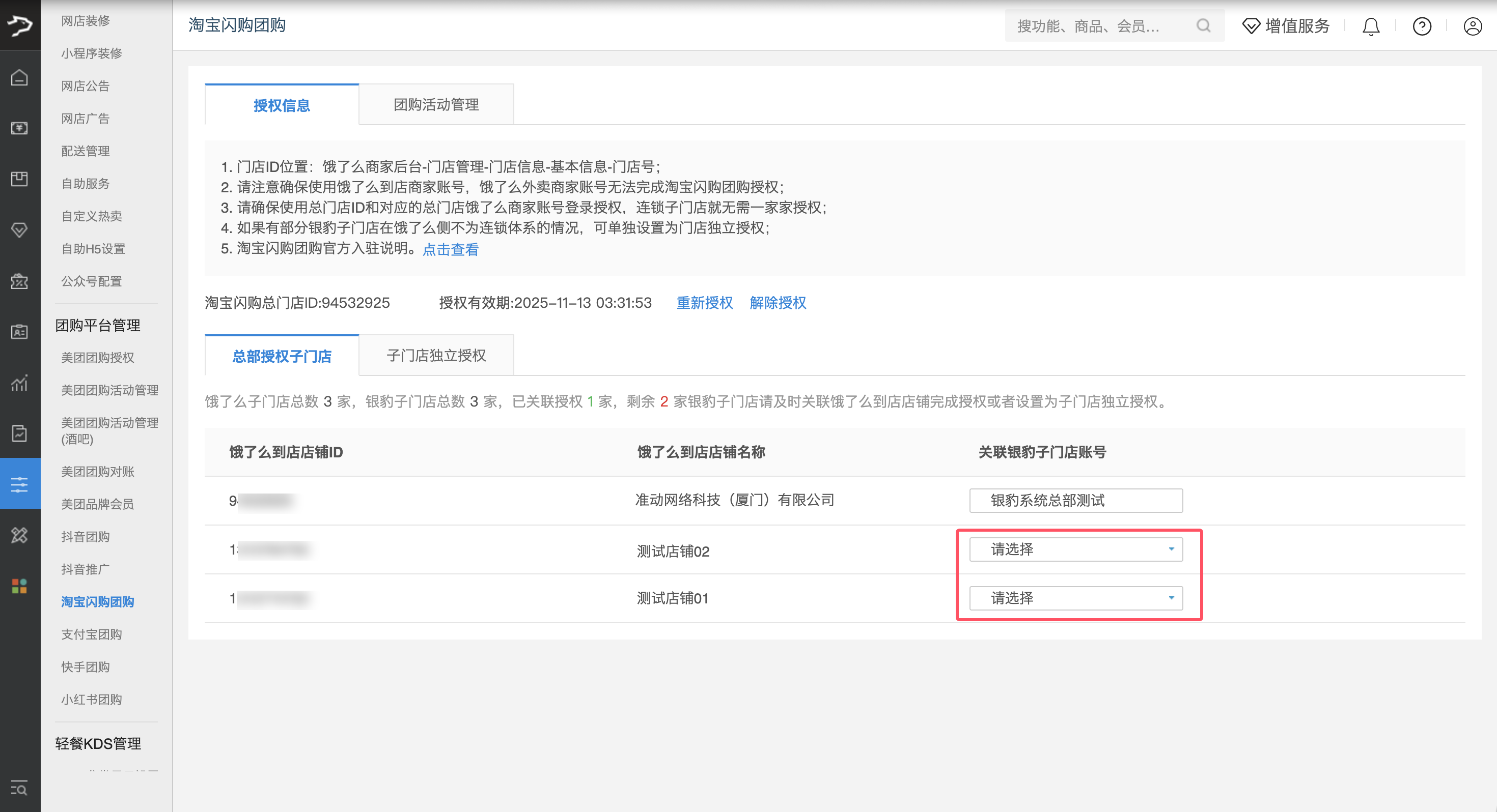 4、授权完成后将自动跳转回银豹淘宝闪购团购授权信息页面,系统会自动将饿了么总门店 ID 与银豹总账号关联绑定,无需手动修改。总部只需将饿了么连锁子门店一一进行关联绑定即可,已关联的子门店无需再进行独立授权。