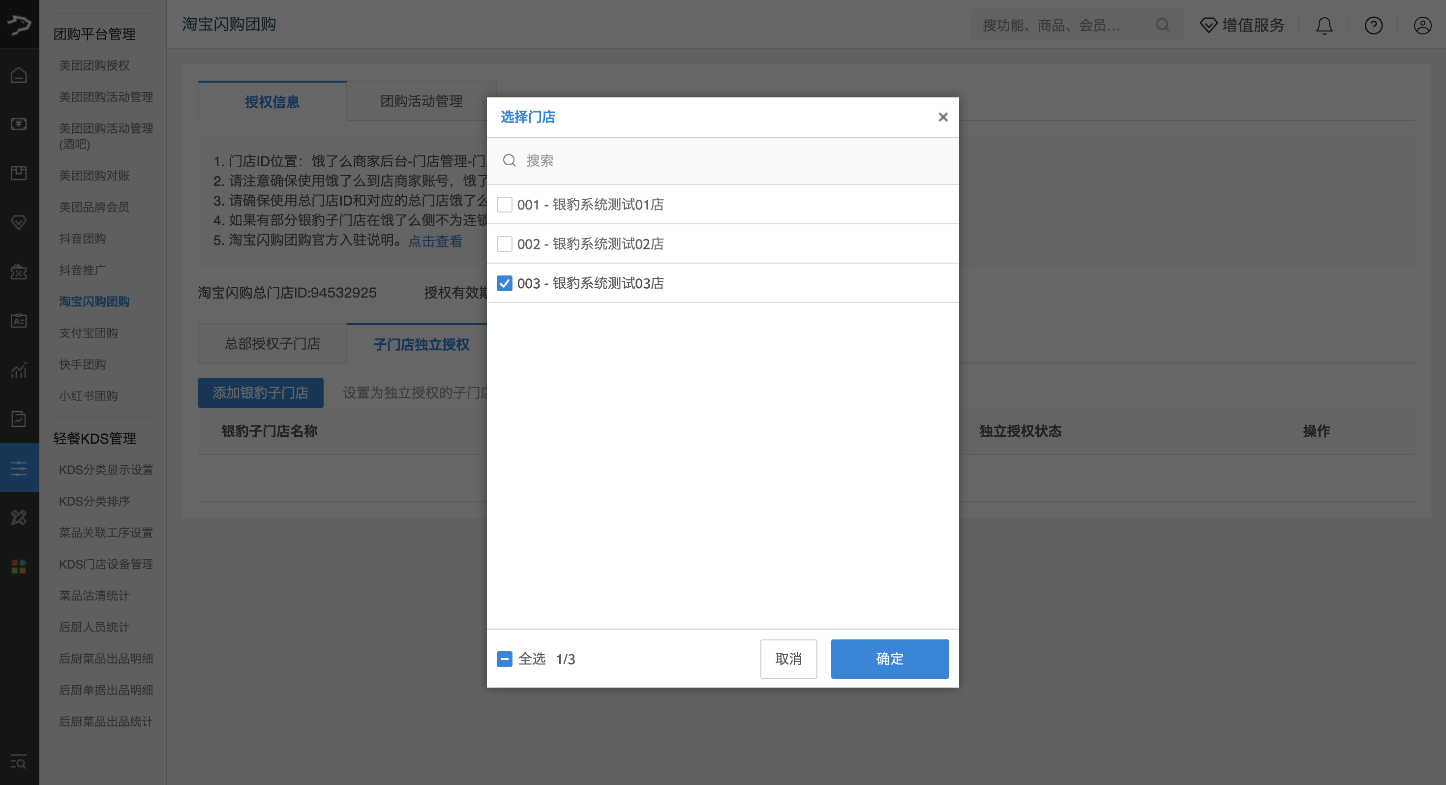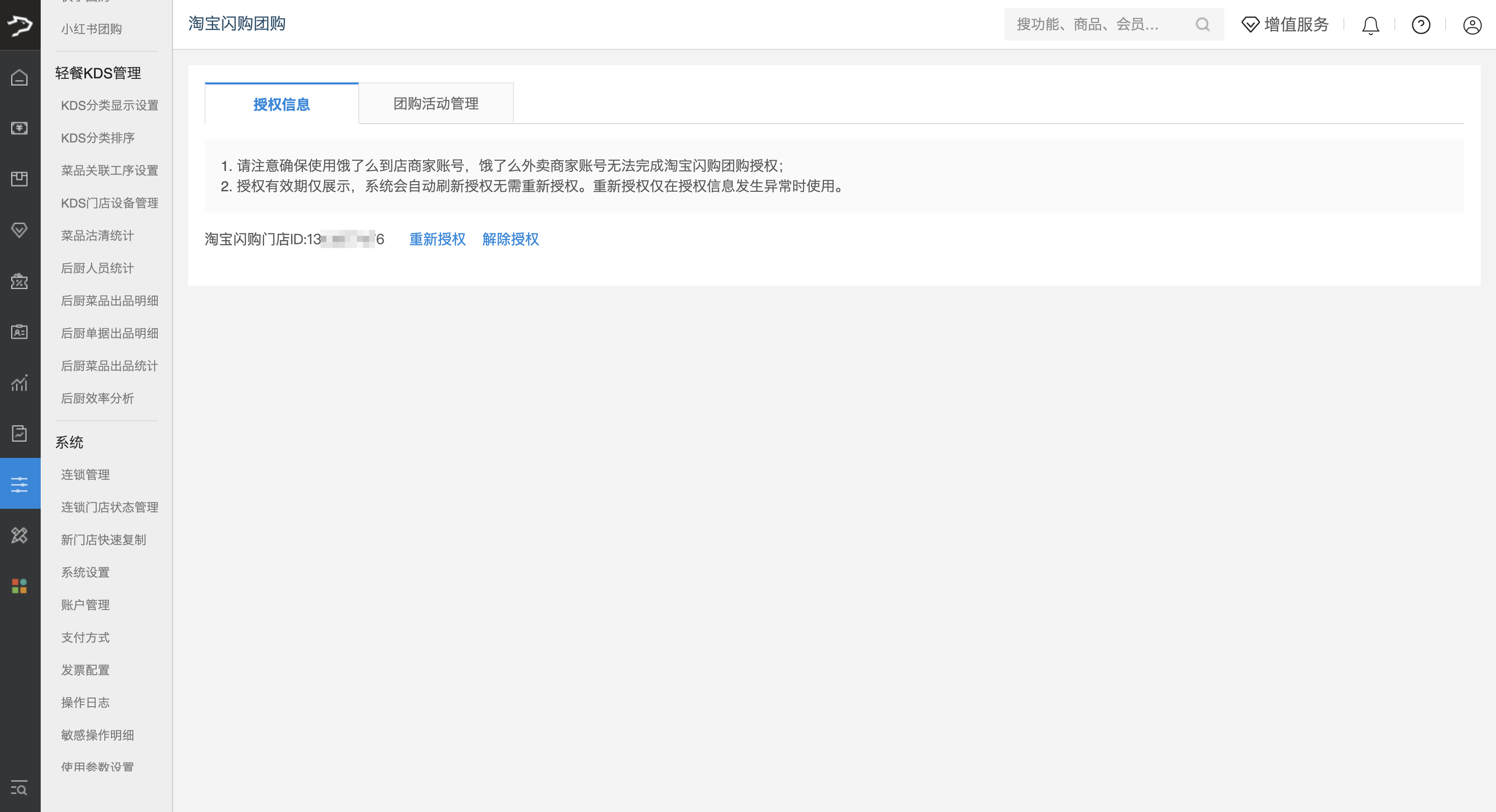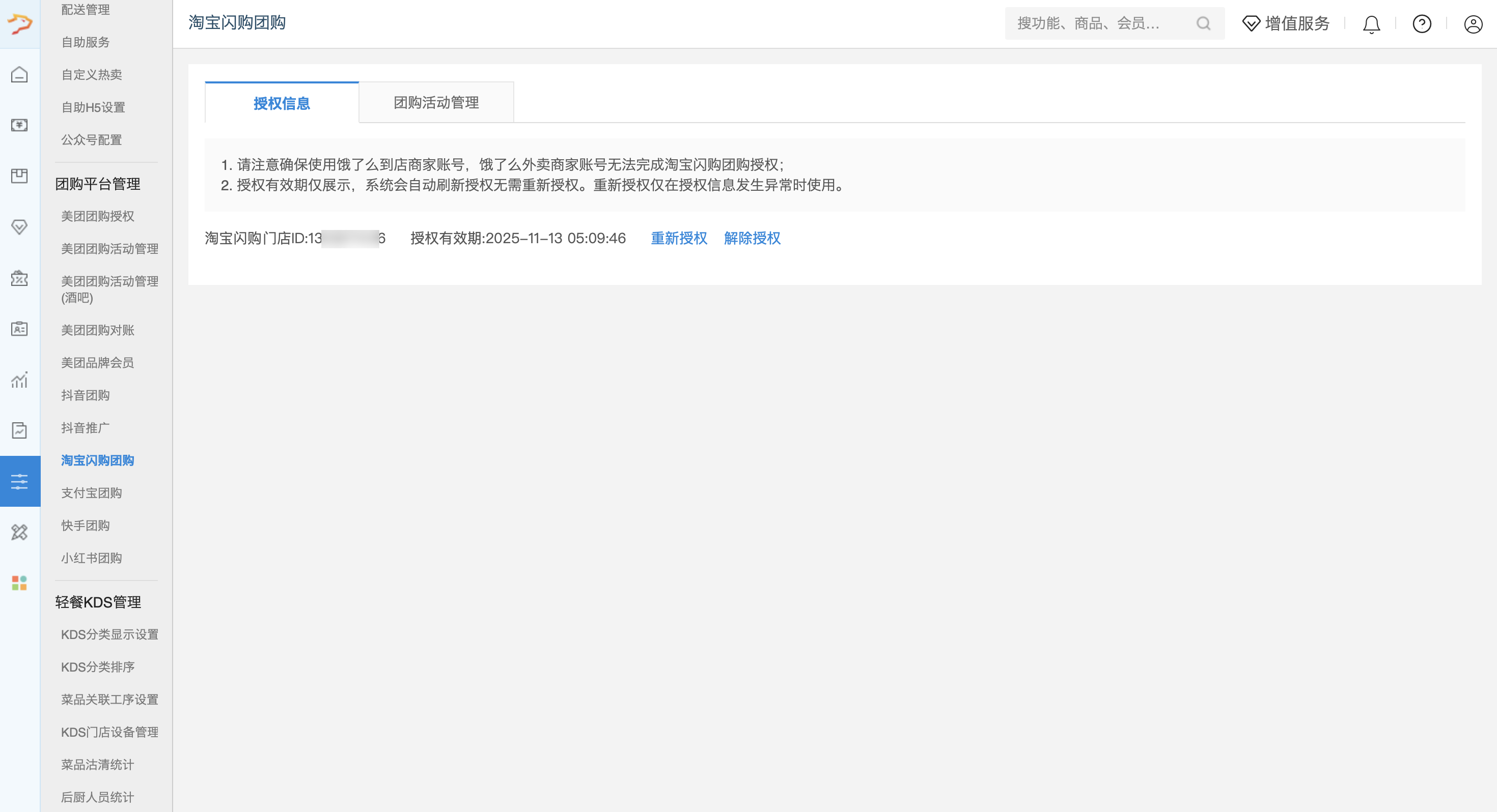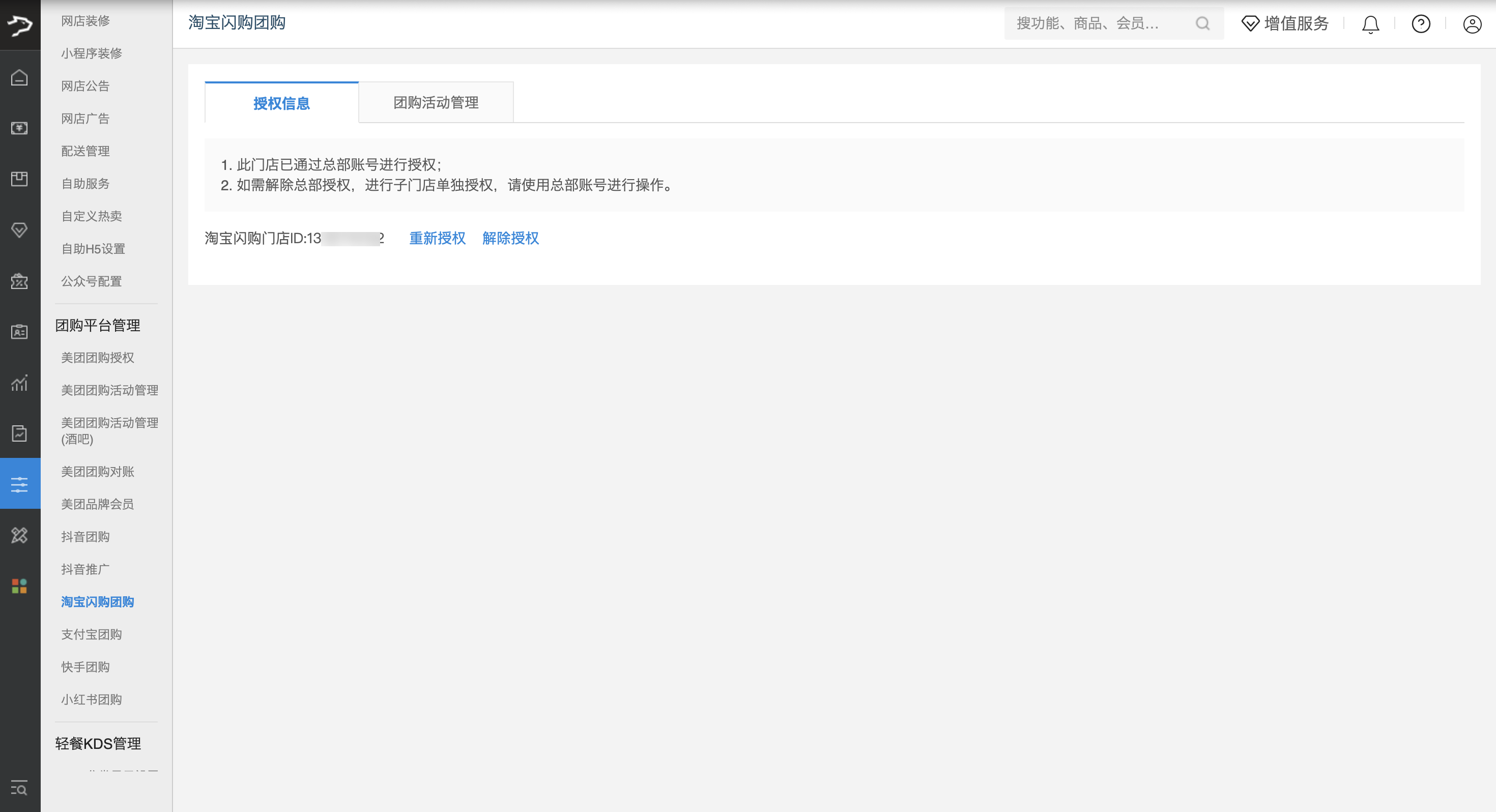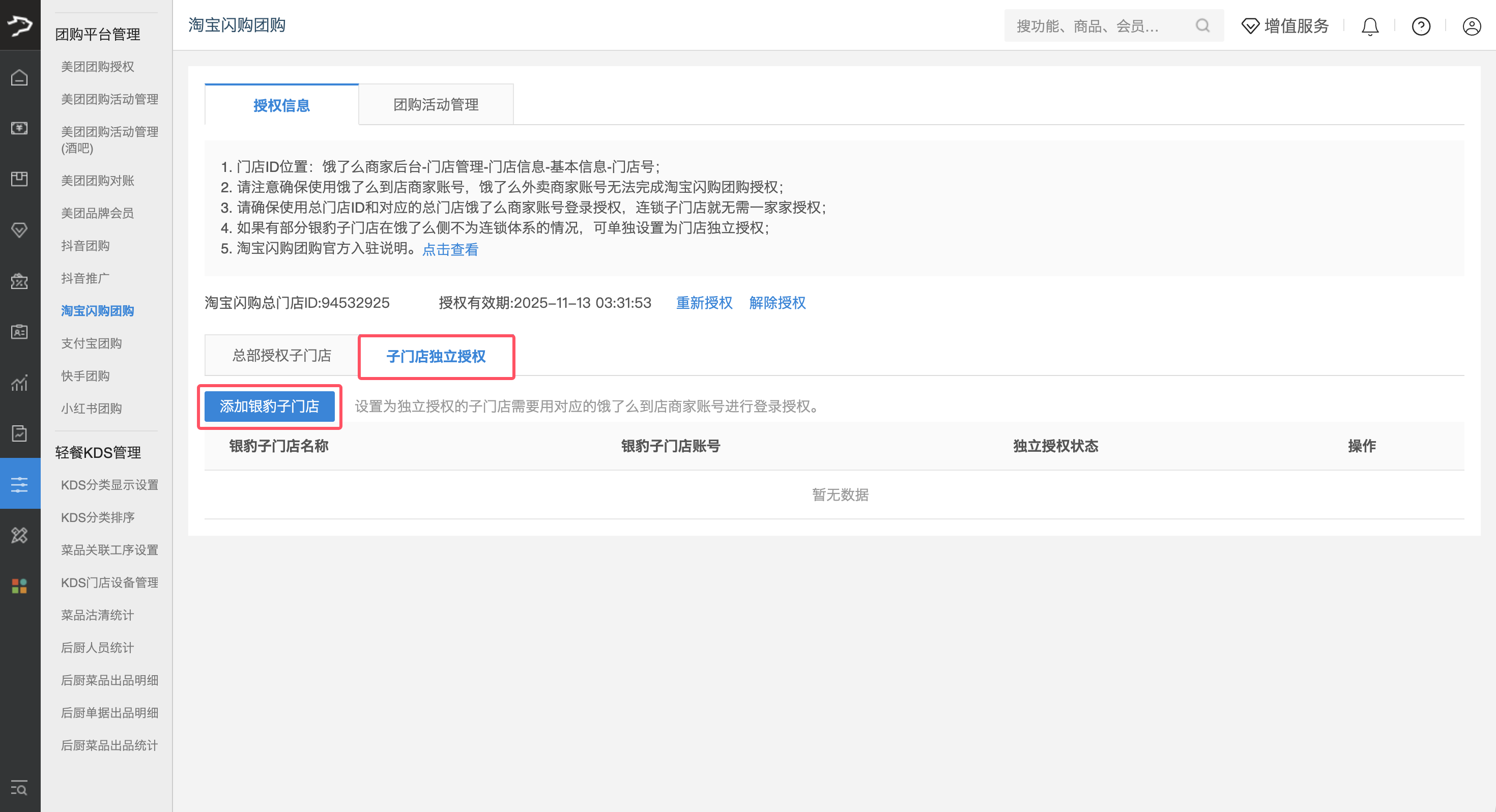 独立授权的子门店,也可用子门店账号登录银豹后台,进入【淘宝闪购团购】页面独立进行授权,授权流程与前述流程一致。
