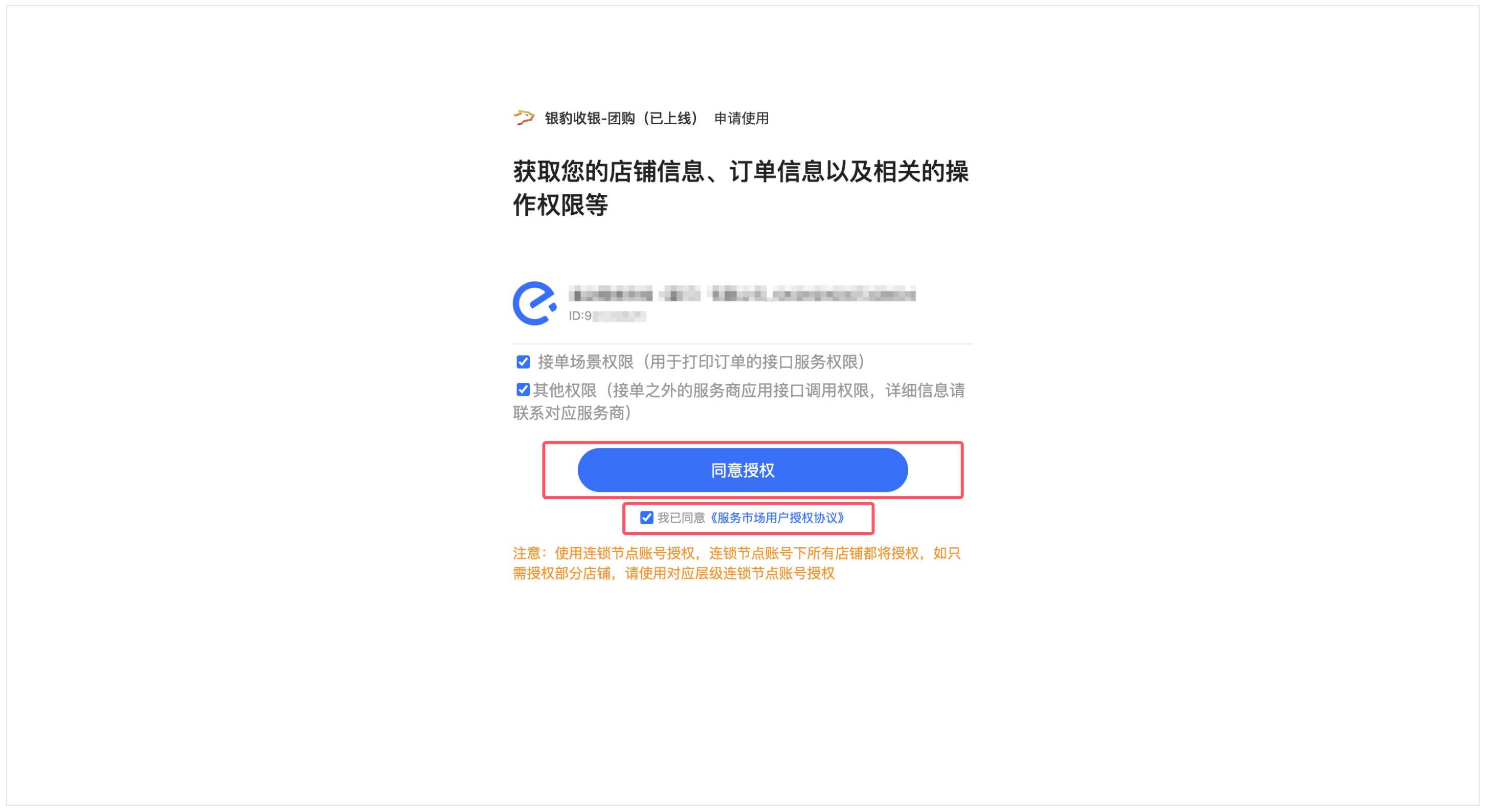 3、登录后勾选 【我已同意《服务市场用户授权协议》】,点击 【同意授权】。