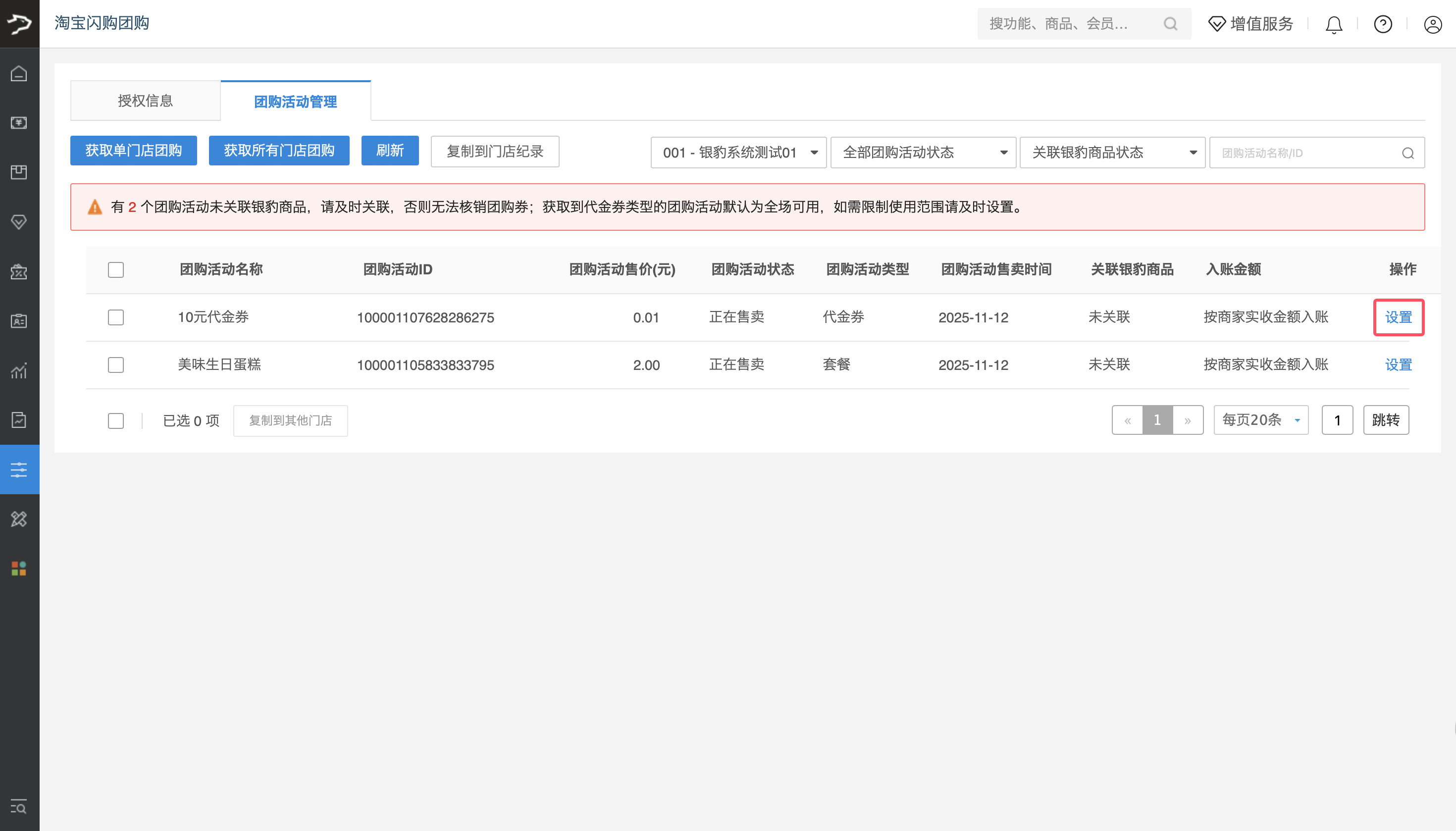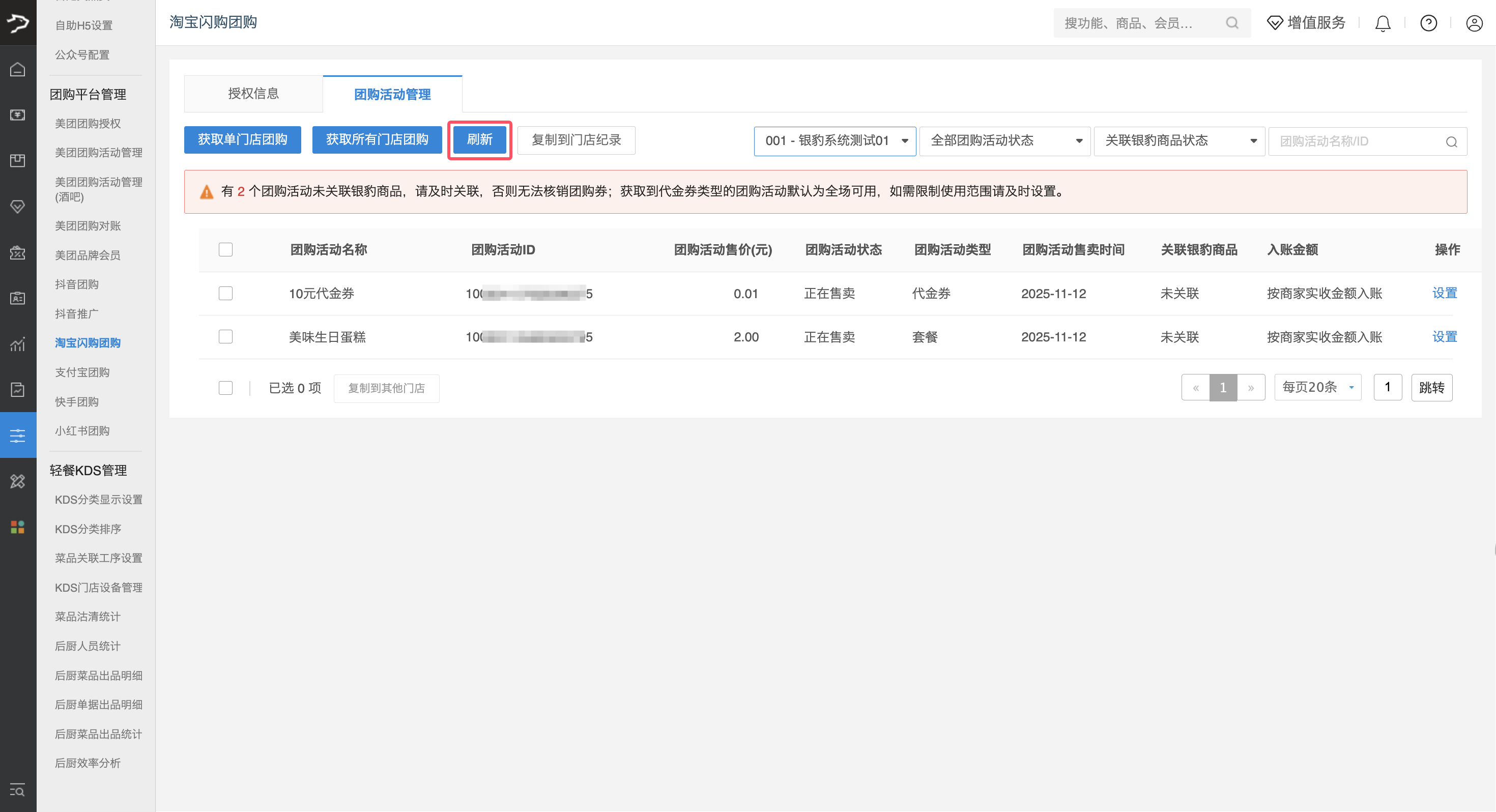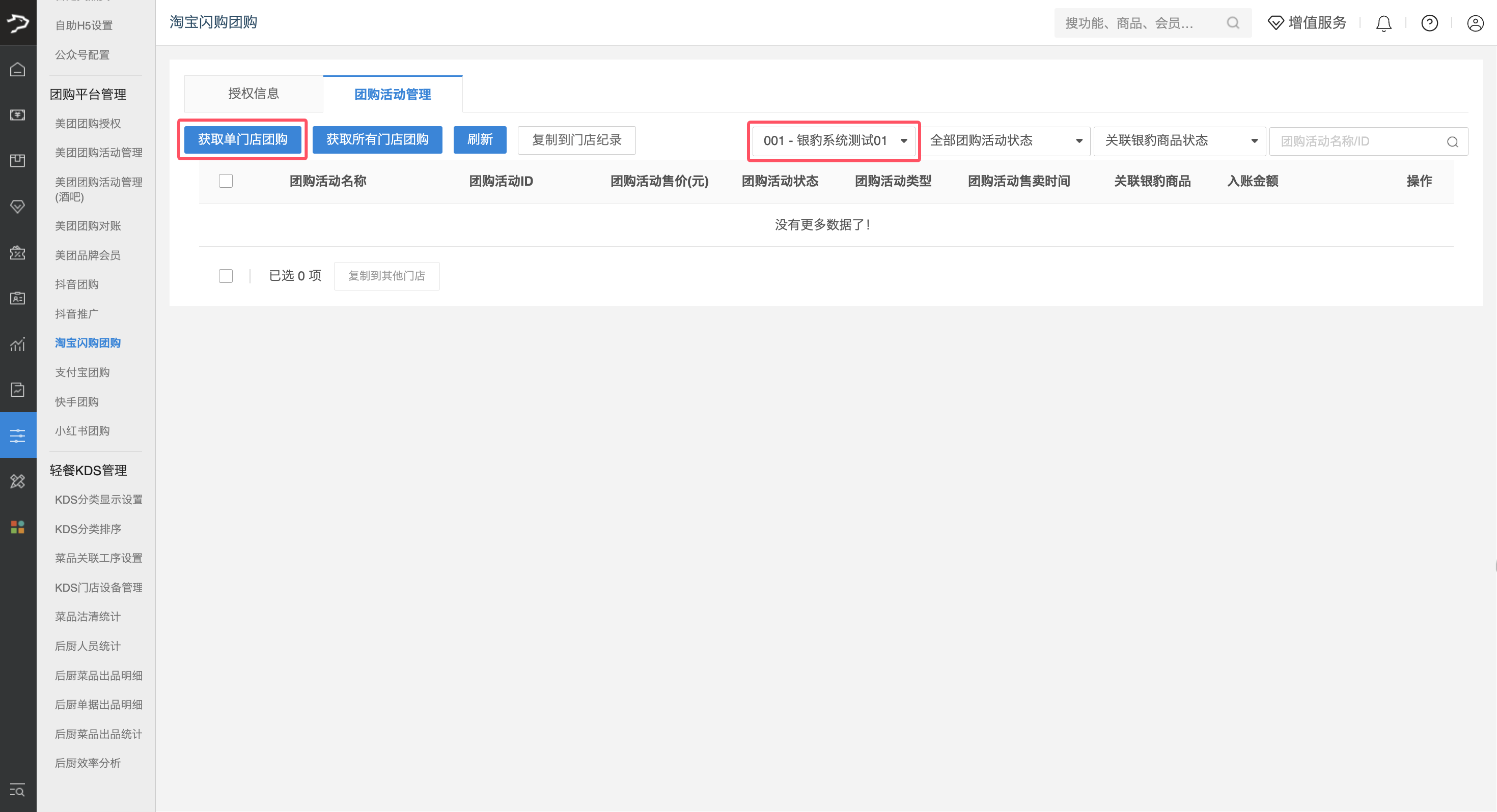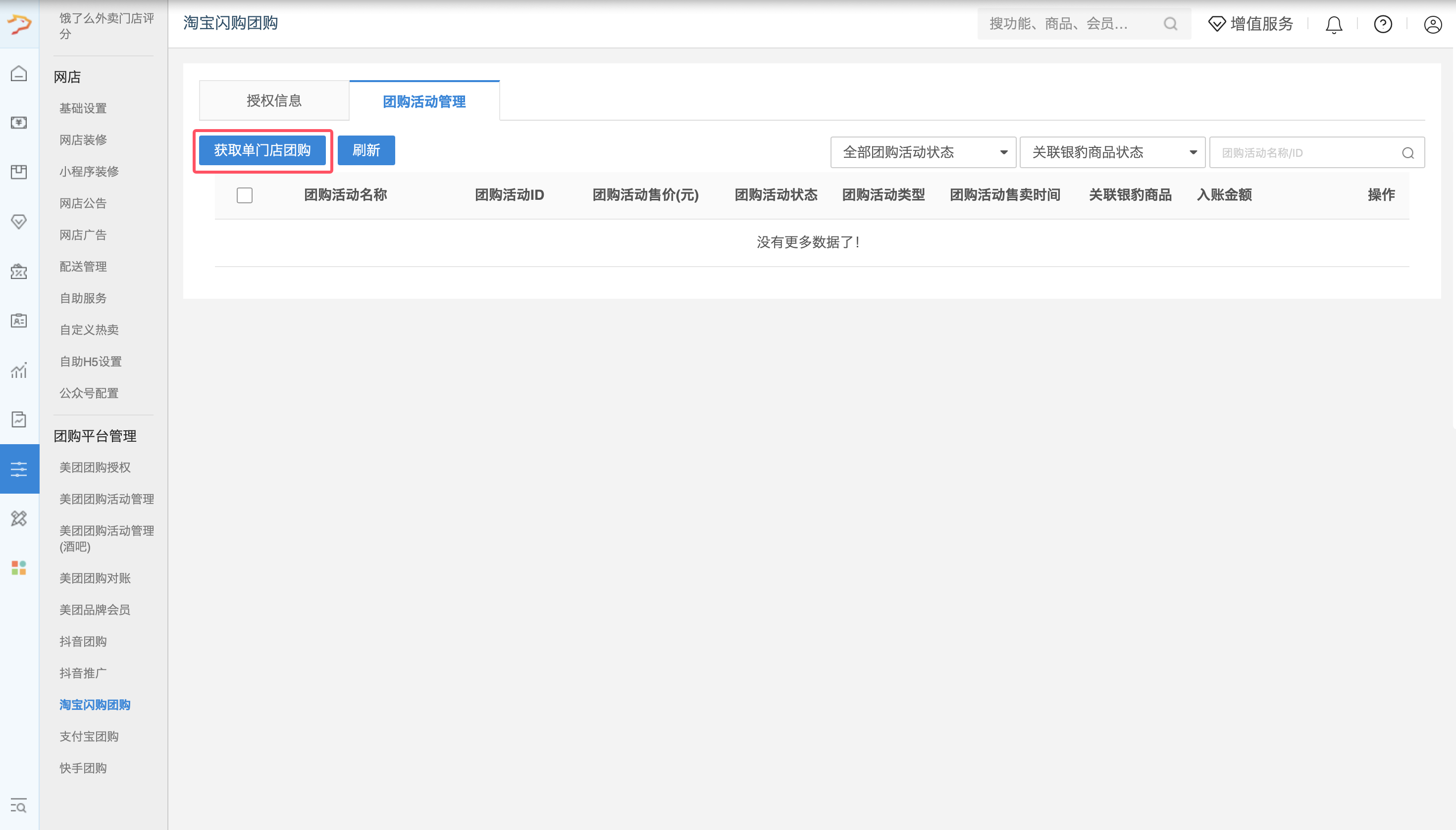 完成授权或饿了么商户平台更新了团购活动,需登录银豹后台进入【淘宝闪购团购】页面的【团购活动管理】标签页操作获取门店团购活动。