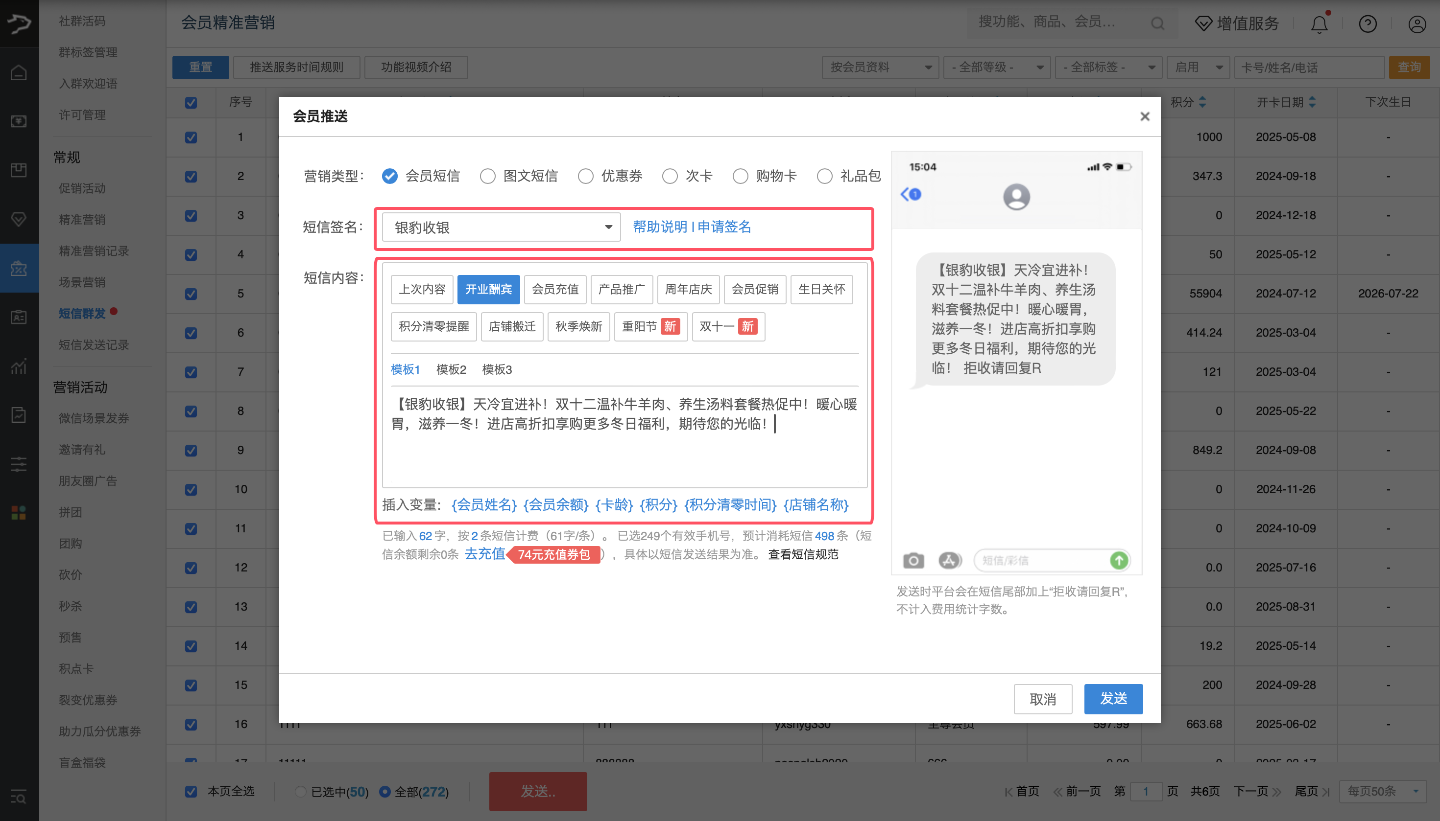 银豹后台,营销-常规-短信群发