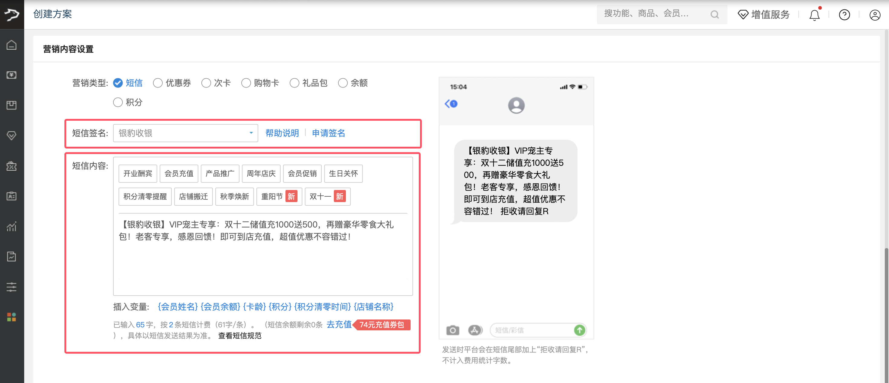 ② 选择营销签名,编辑短信内容,可自由编辑,也可选用系统模板,不同场景有丰富模板供参考。