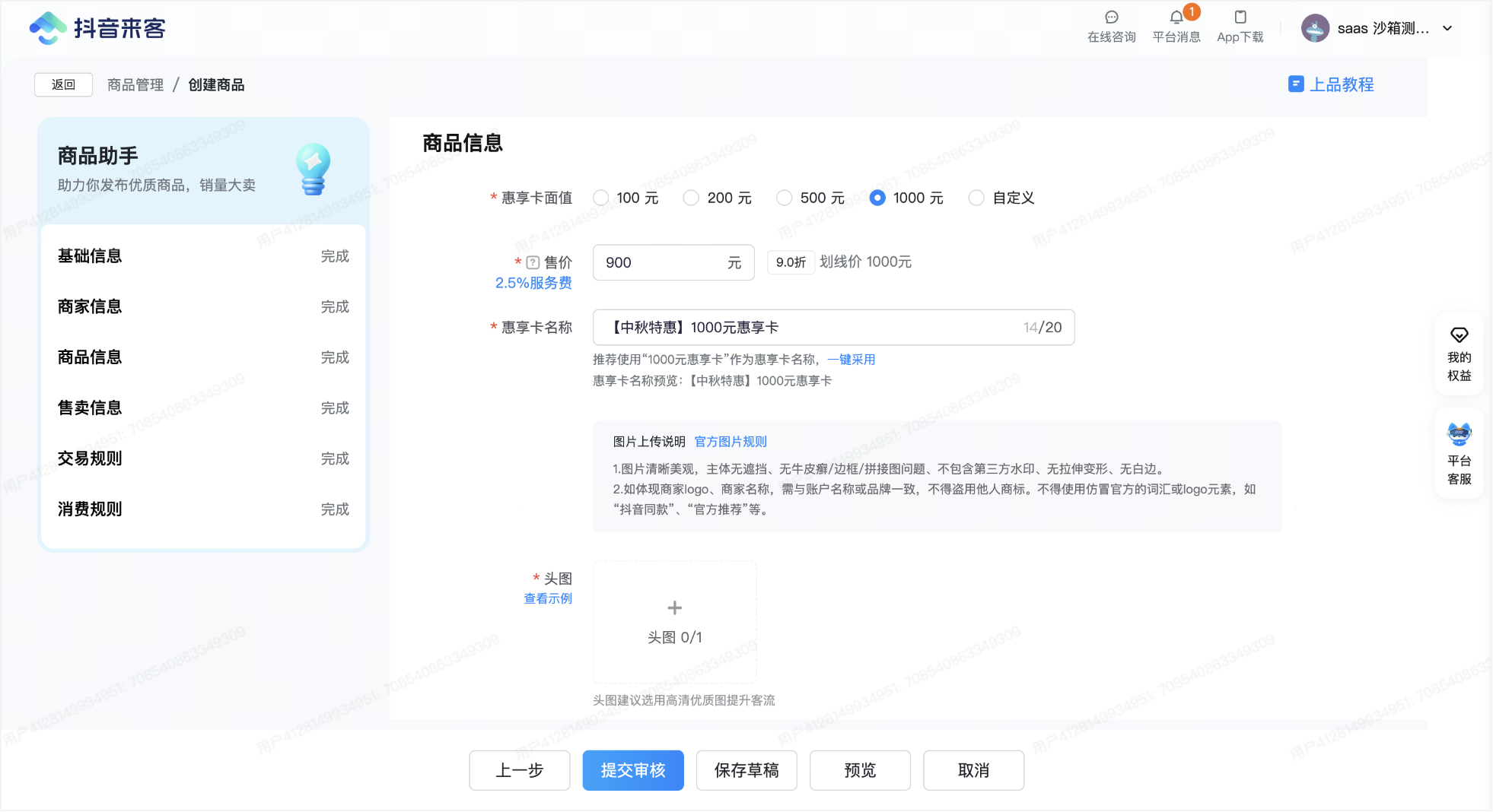 3、配置商品信息,选择卡面值(面值最高不超过1000元),填写商品名称。
