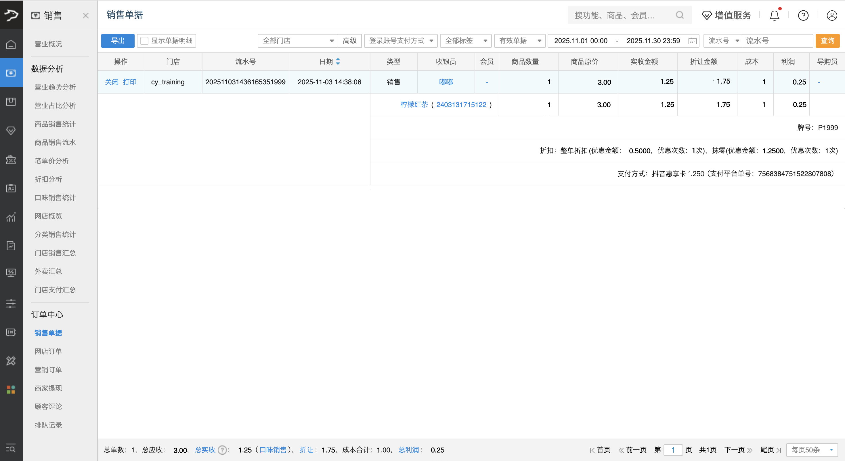 若收银员完成抖音惠享卡核销后,出现误核销、顾客退货等需撤销核销的情况,可进入银豹POS端「销售单据」页面,检索并找到对应核销单据,执行反结账操作即可撤销核销。