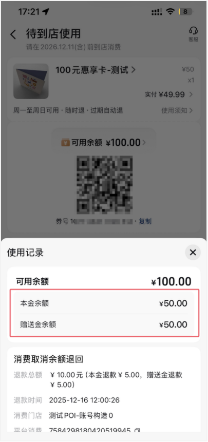 核销前用户可随时申请退款、无需商家审核,其中退款金额将按照 本金:赠送金 等比例退款。