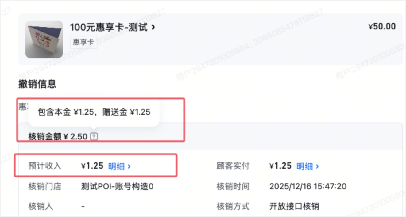 用户购买后会获得一个专属核销码,到店消费时出示给商家,商家通过扫码枪扫码后输入消费金额,系统自动