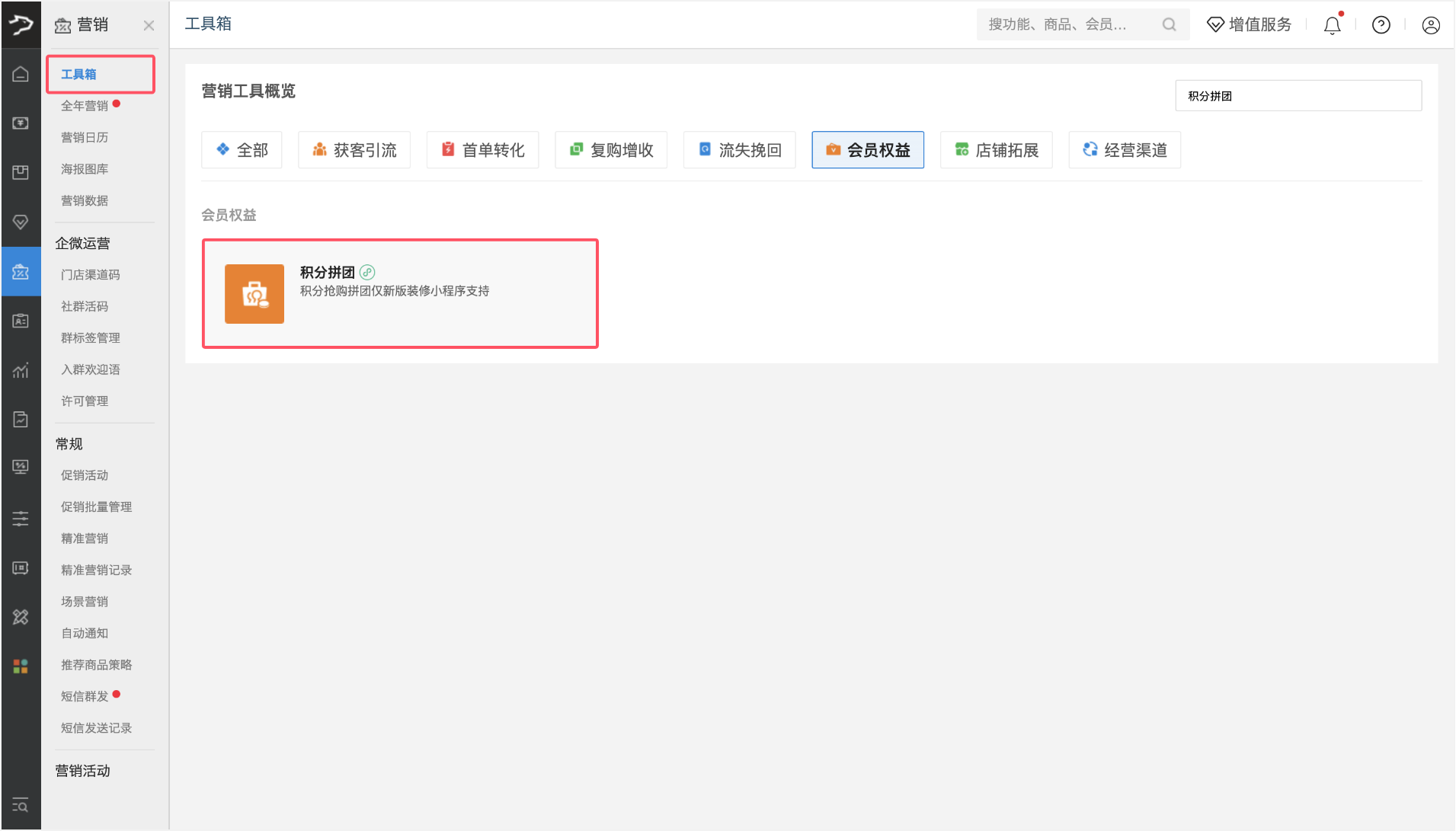 银豹后台,营销-工具箱-积分拼团