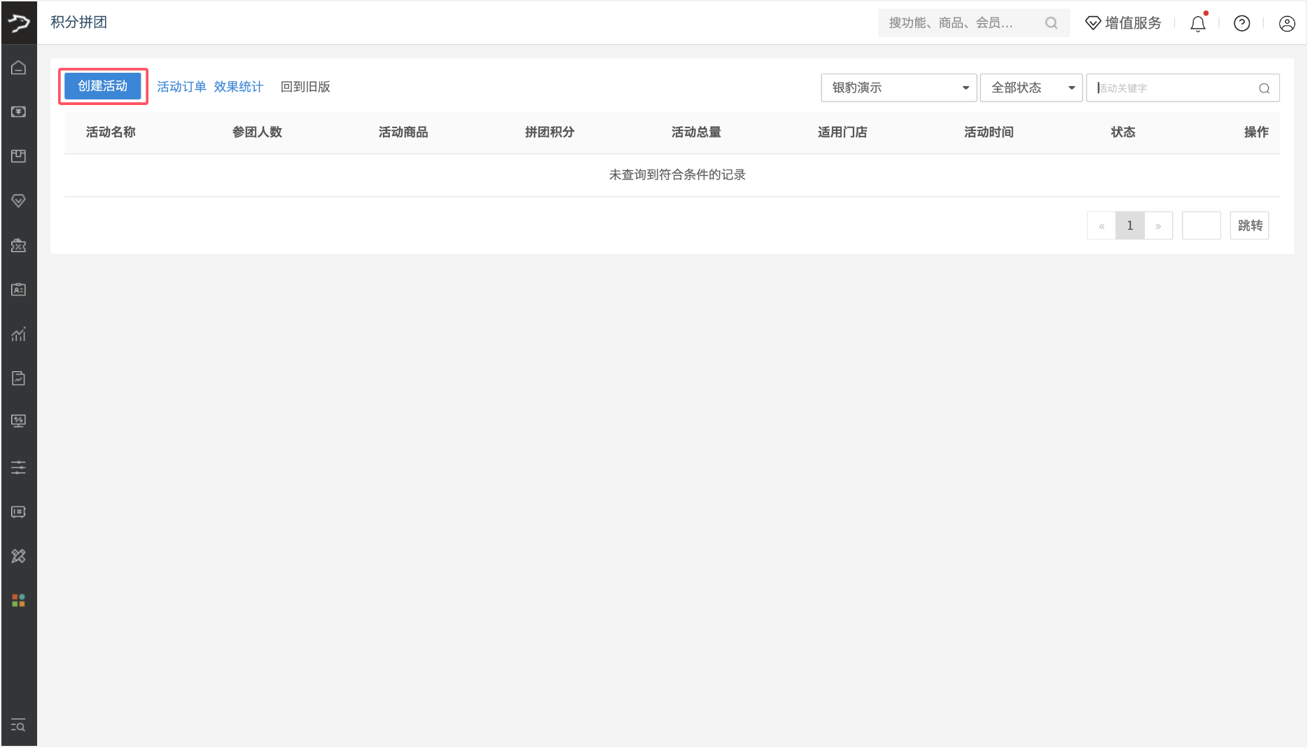 1、进入积分拼团页面后,点击左上角【创建活动】按钮,进入活动配置页面。