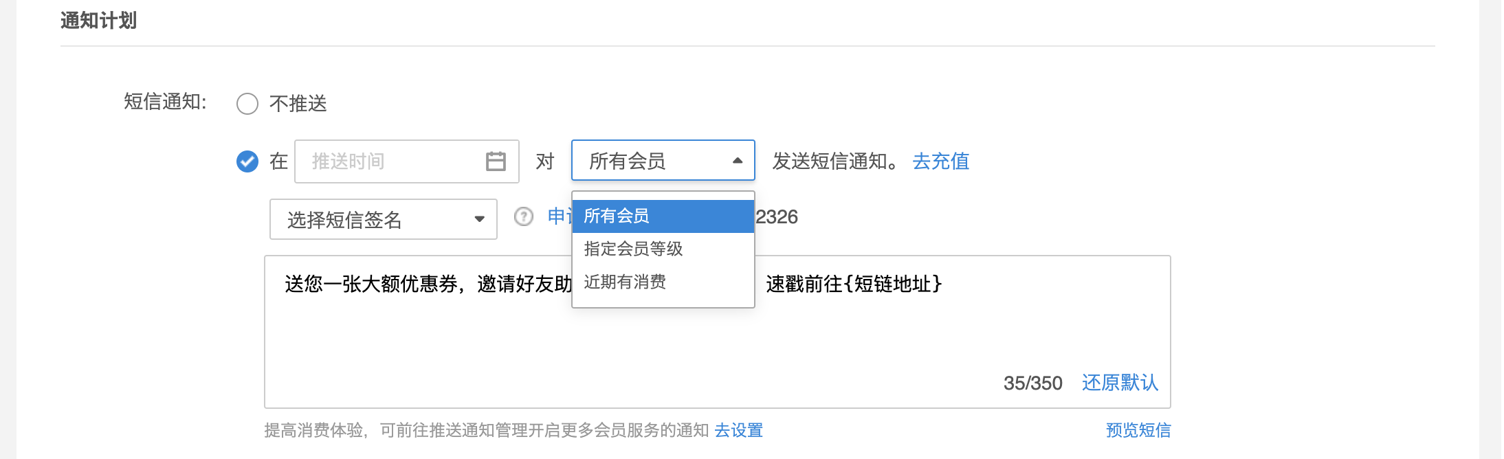 选择是否推送短信通知,若选择「推送」,可配置推送时间、目标对象,自定义短信内容。
