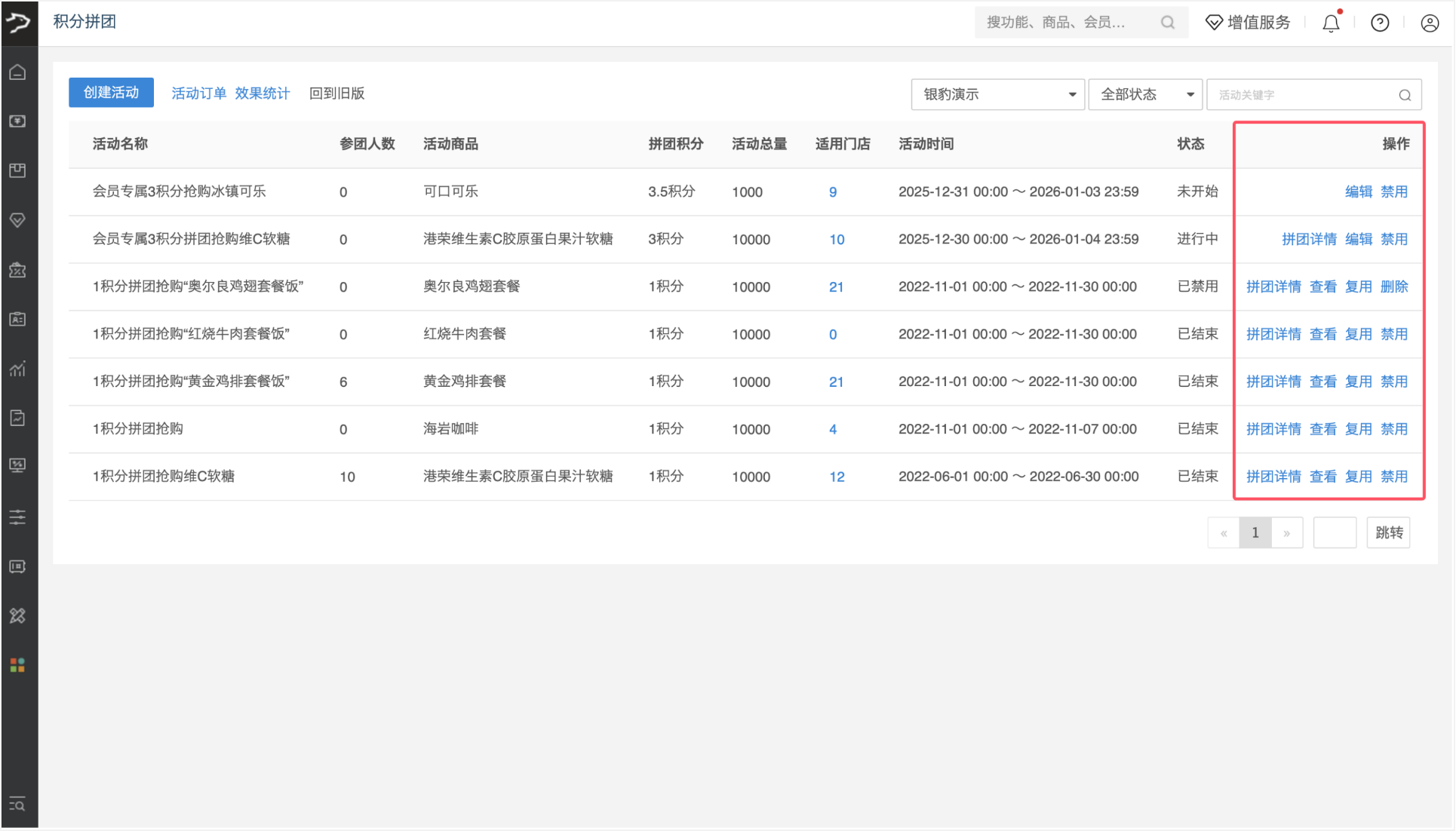 银豹后台,营销-工具箱-积分拼团-查看某个积分拼团活动
