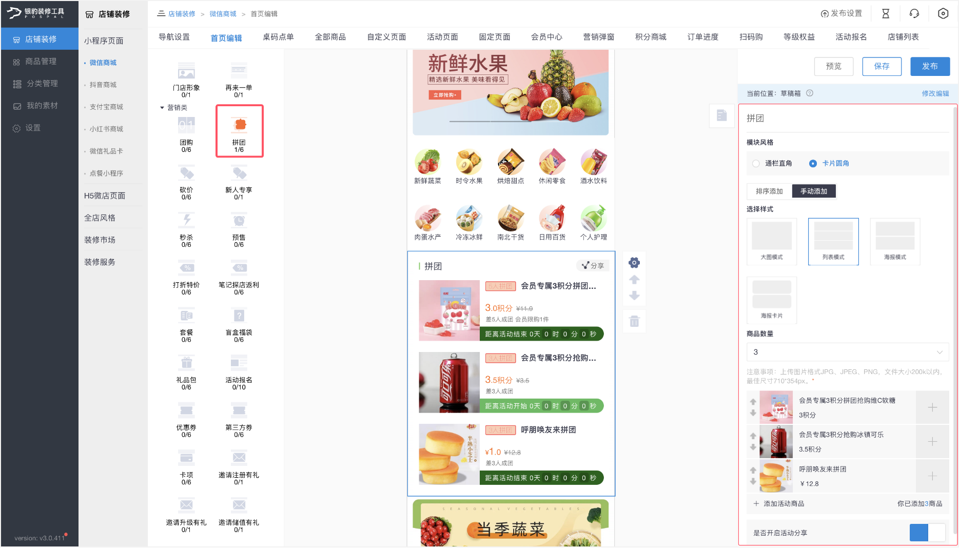 进入「首页编辑」页面,添加「拼团」模块后,在右侧可按需设置模块风格(如通栏直角 / 卡片圆角)、选择样式(如大图 / 列表 / 海报模式)、调整展示商品数量,同时可开启活动分享功能。
