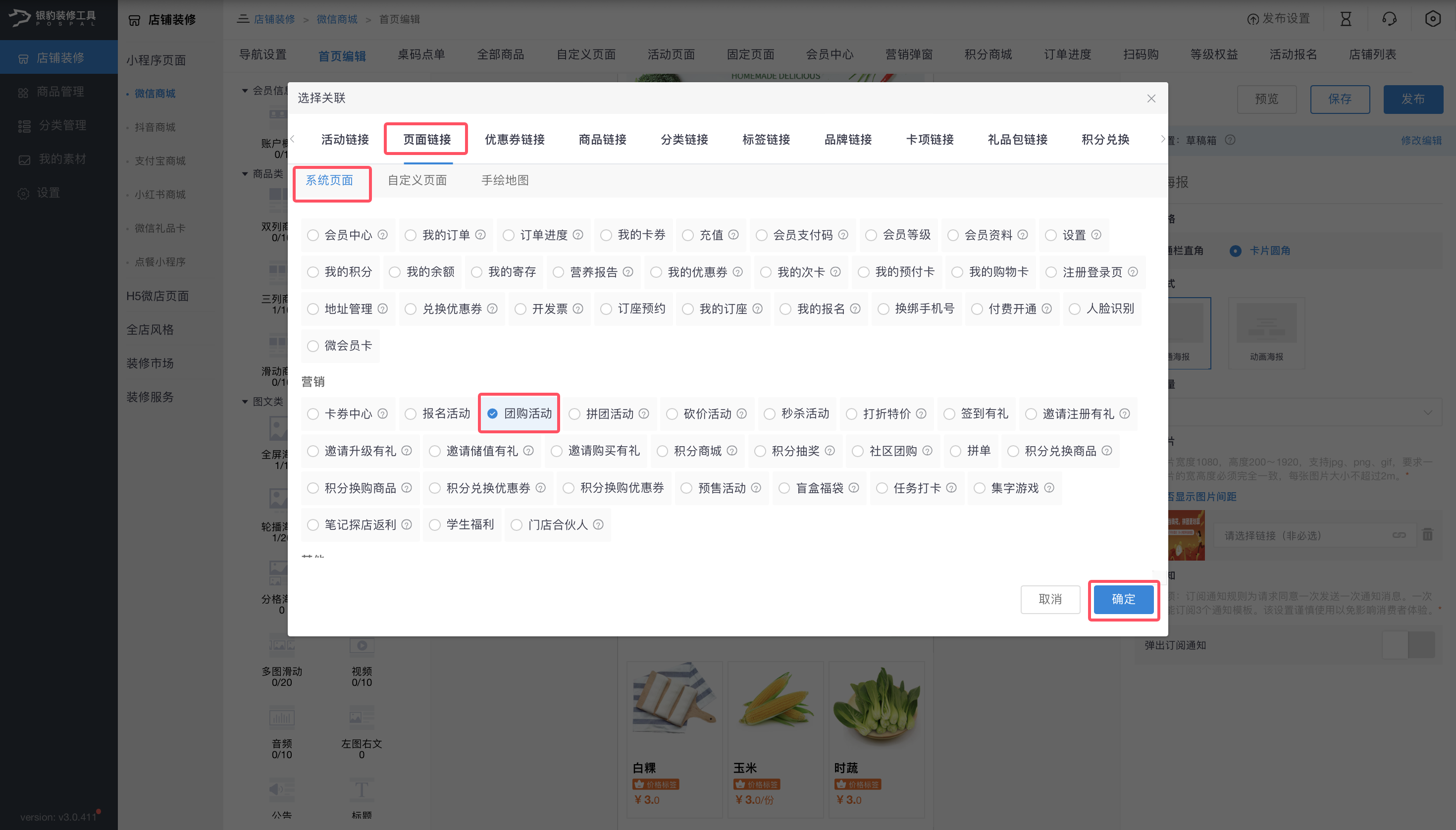 2、如需设置跳转至拼团活动页面,在选择关联窗口中依次操作:页面链接 → 系统页面 → 页面类型选择营销 → 拼团活动 → 点击【确定】。