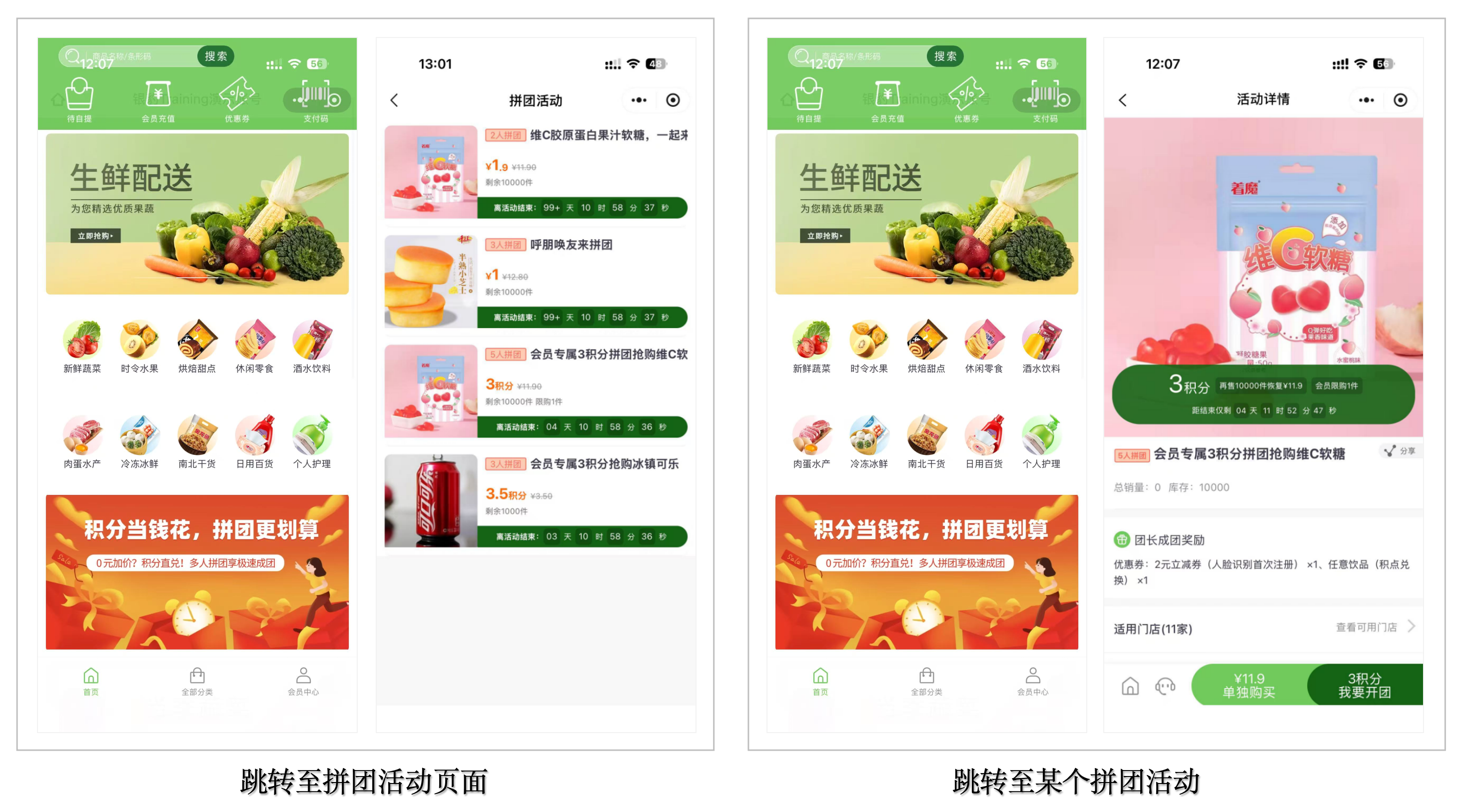 流程:浏览拼团活动商品->点击我要开团->选择自提/配送,完成支付->邀请好友拼团->拼团成功->商家发货/到店自提->订单完结