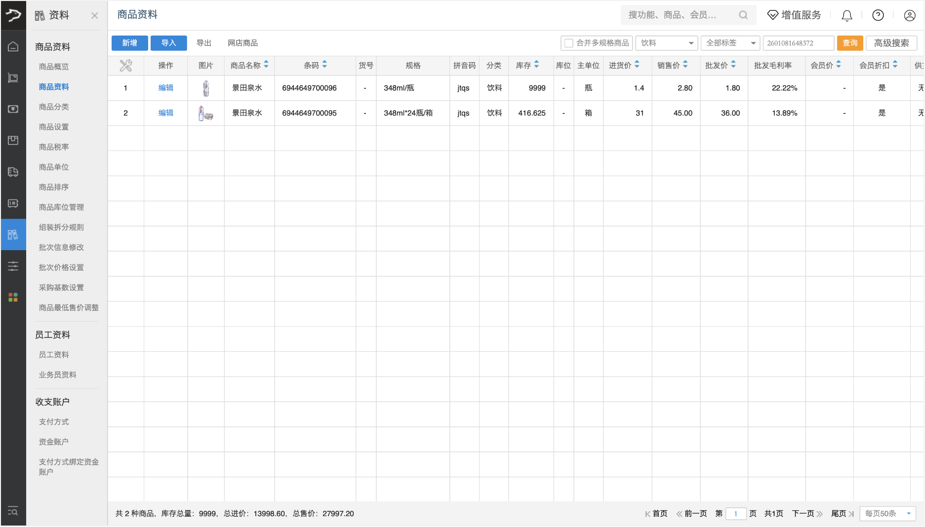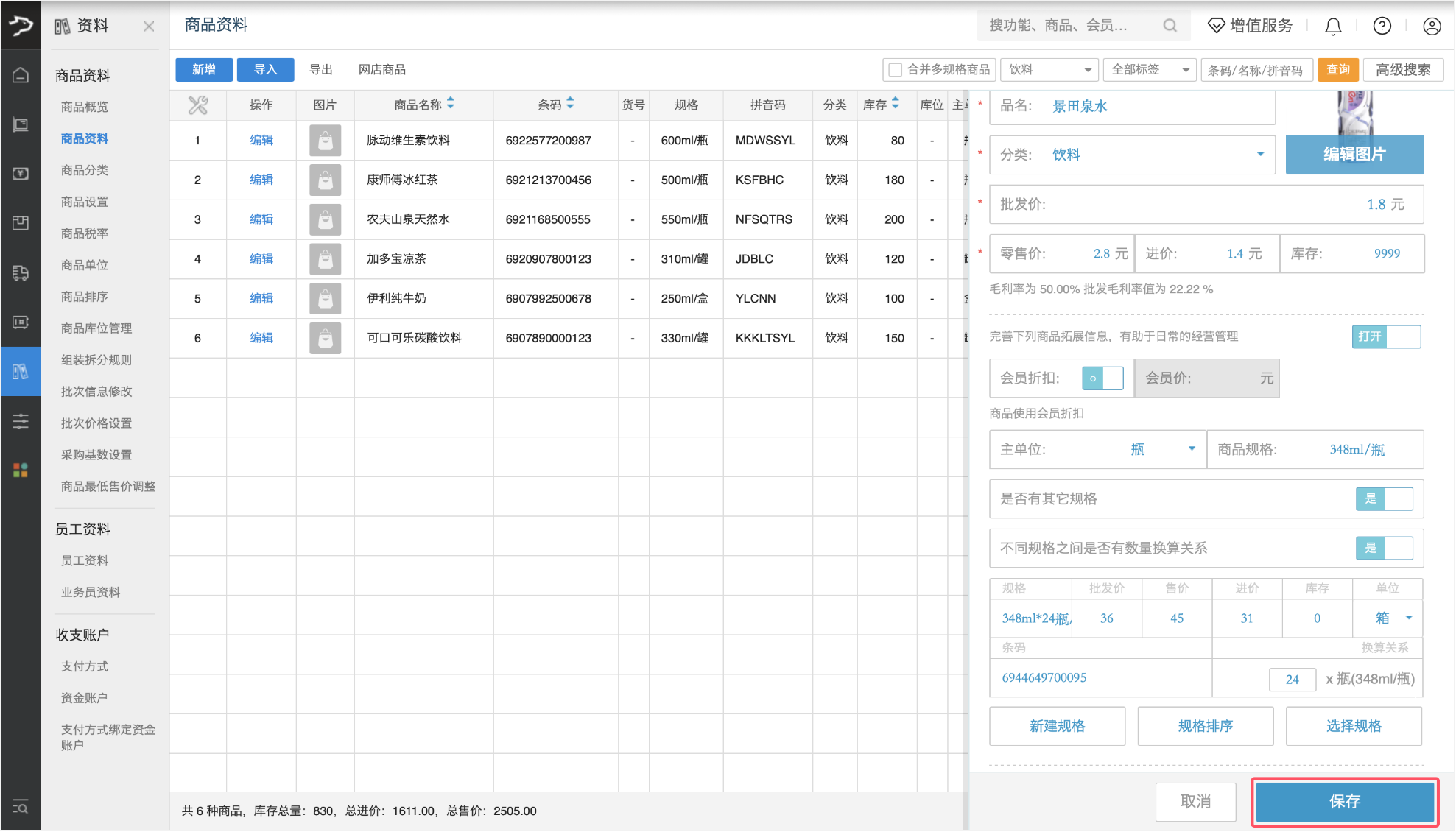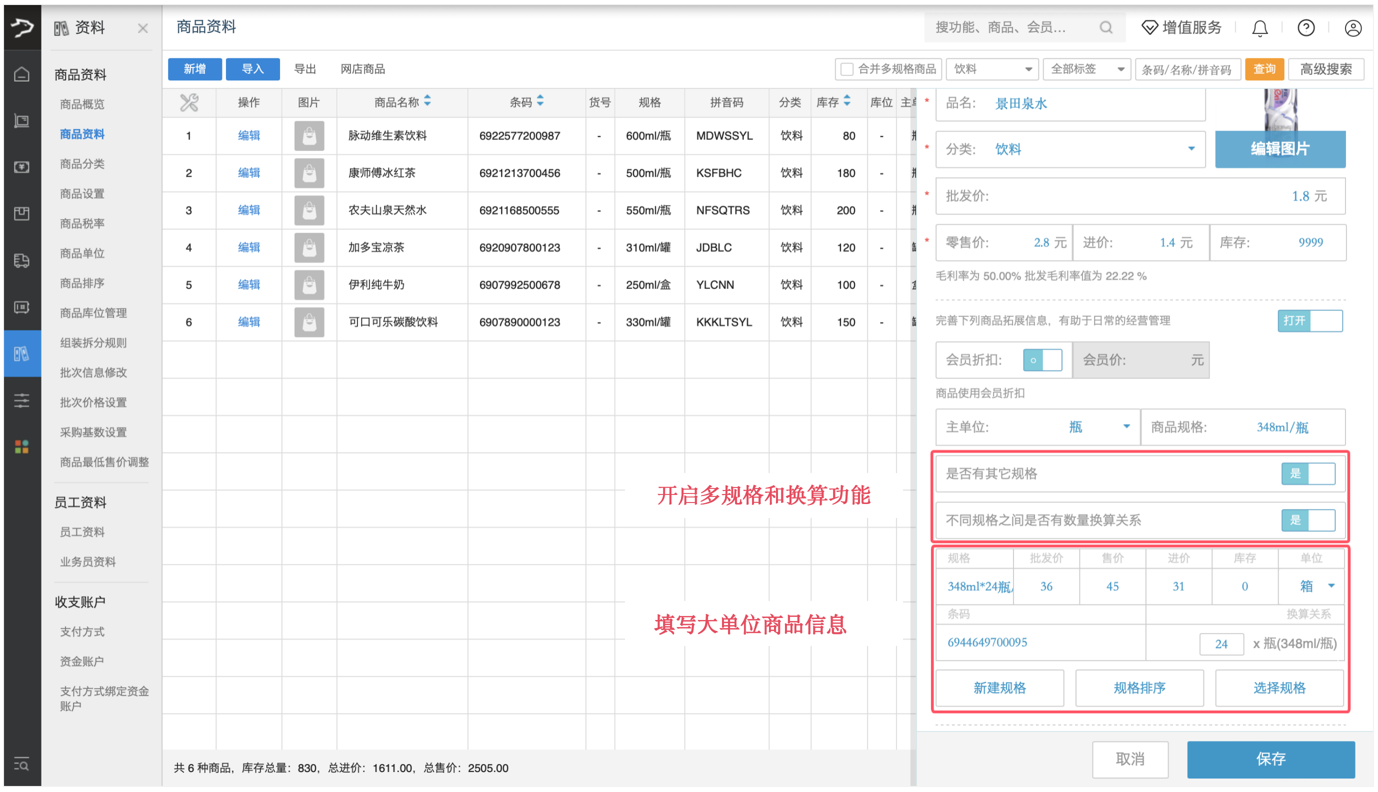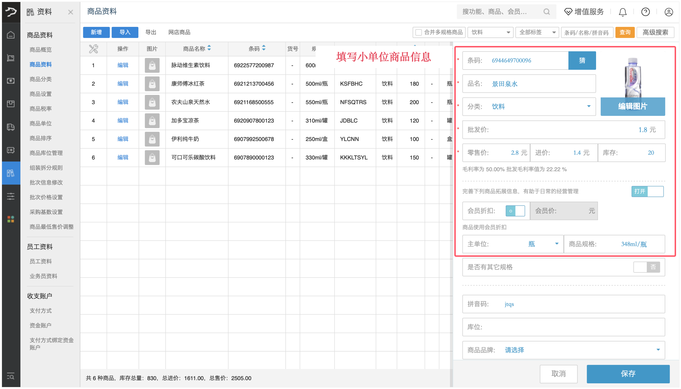 1、在商品资料页创建商品时,先填写小单位商品信息(如景田矿泉水 “瓶”):条码、品名、批发价、零售价、进价、库存、主单位、商品规格等。