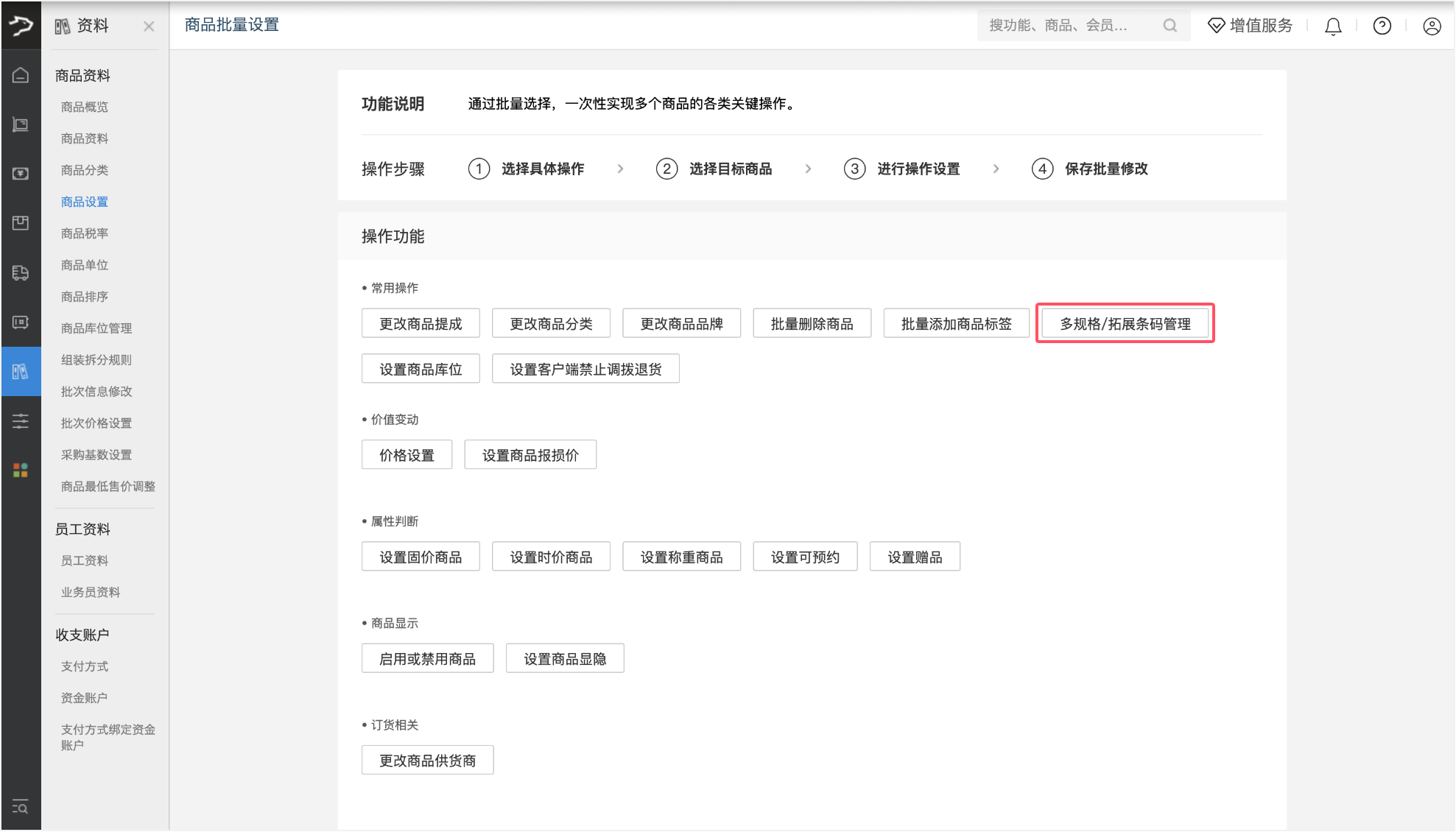1、进入商品设置页,在常用操作中点击【多规格 / 拓展条码管理】,进入商品属性管理界面。