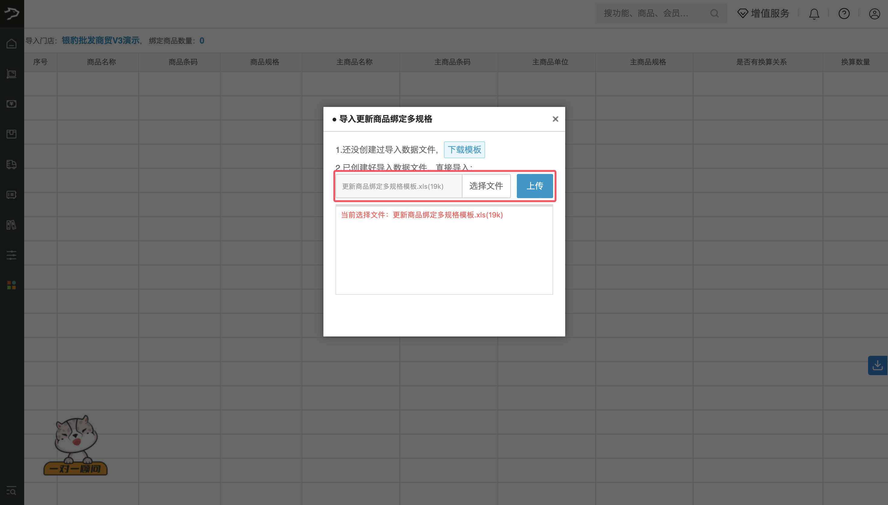 3、在弹出的 “导入更新商品绑定多规格” 窗口中,点击【下载模板】,并按模板要求填写以下信息后保存文件。