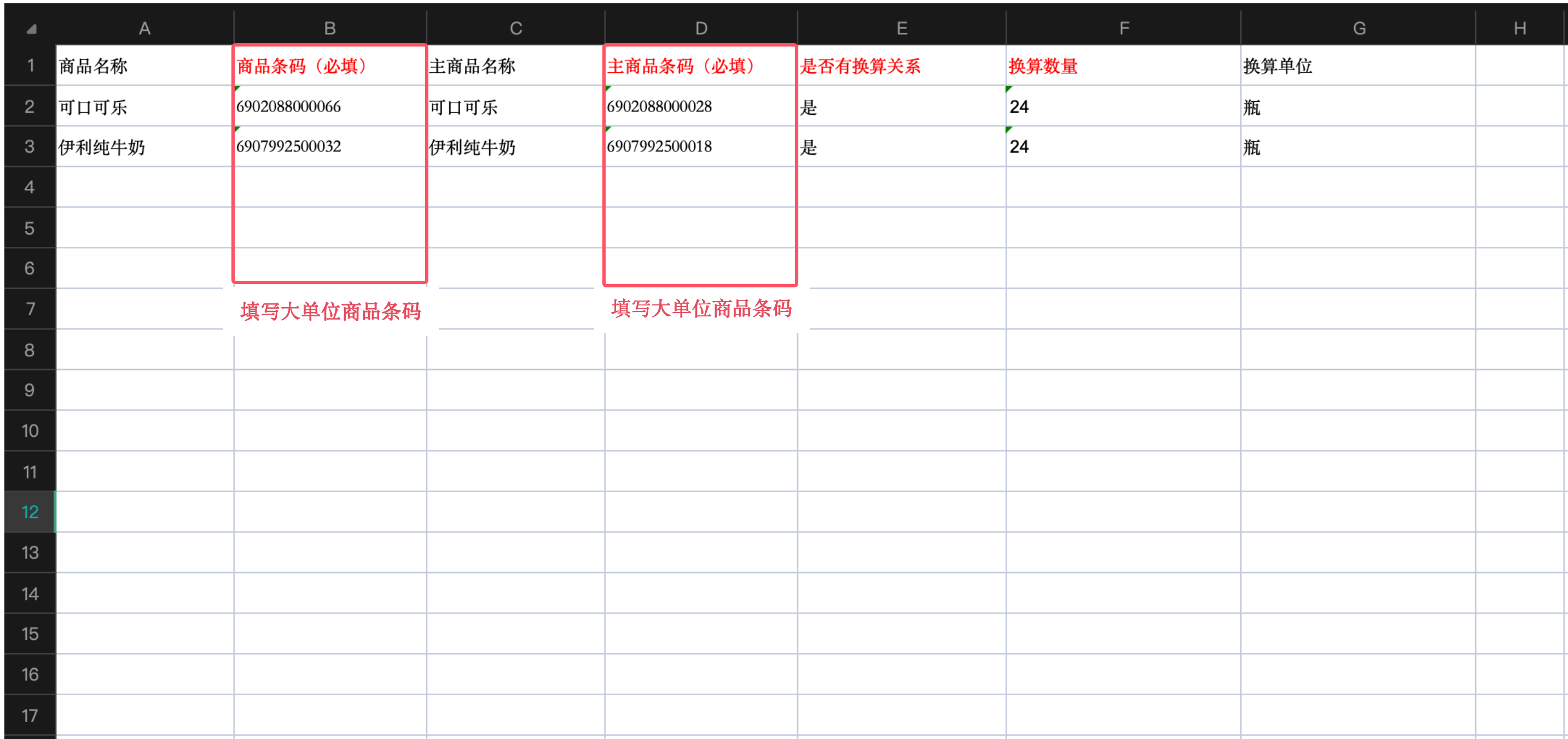 ⚠️ 注意:商品条码、主商品条码、是否有换算关系、换算数量为必填项;商品条码填大单位条码,主商品条码填小单位条码;条码为数字时需设为文本格式。