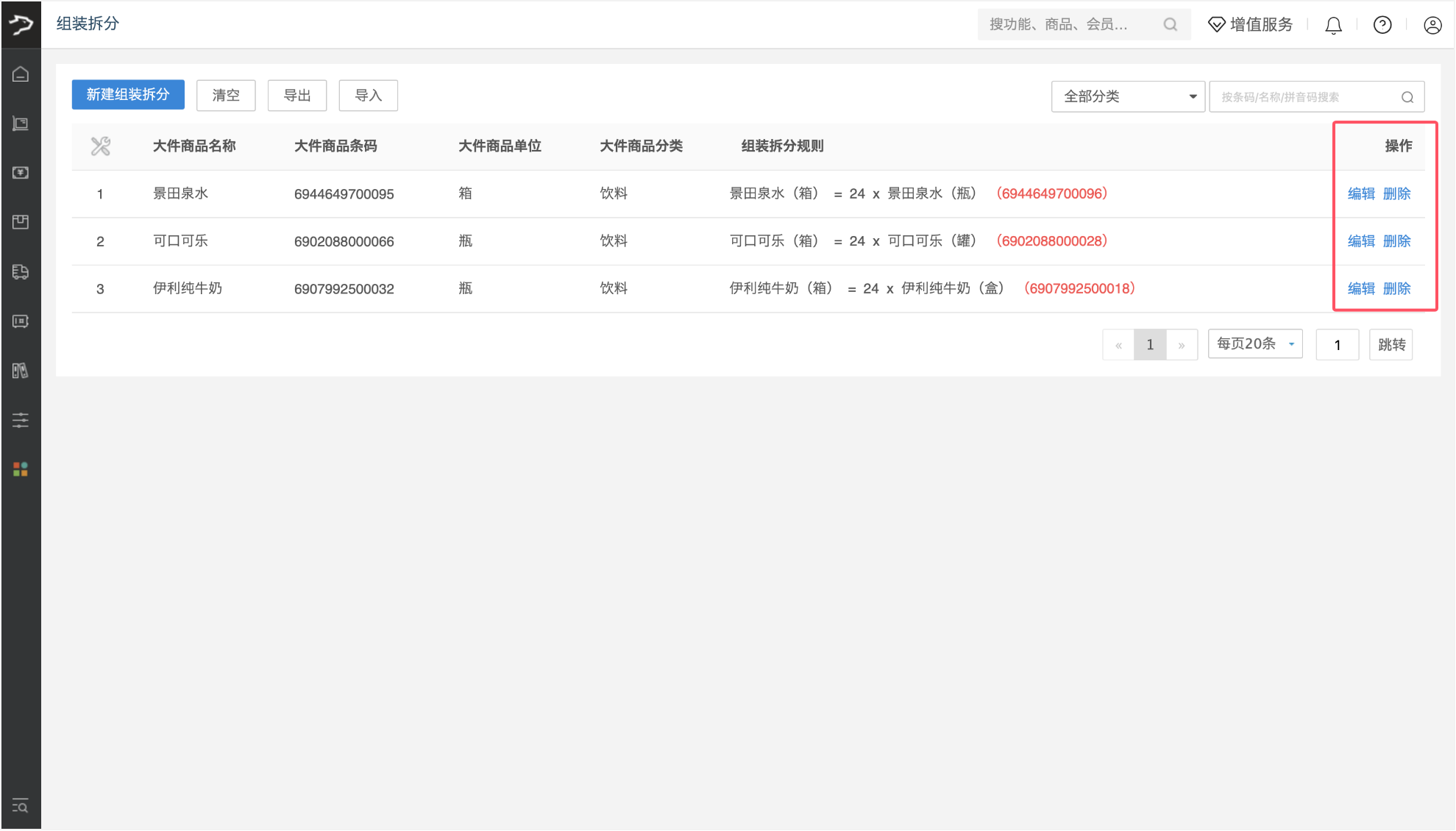商品设置换算关系后,可前往组装拆分规则页面查看对应的换算规则,可根据需要进行编辑(仅限换算关系数量)、删除操作;如需更换商品,请先删除原有组装拆分规则,再重新创建。