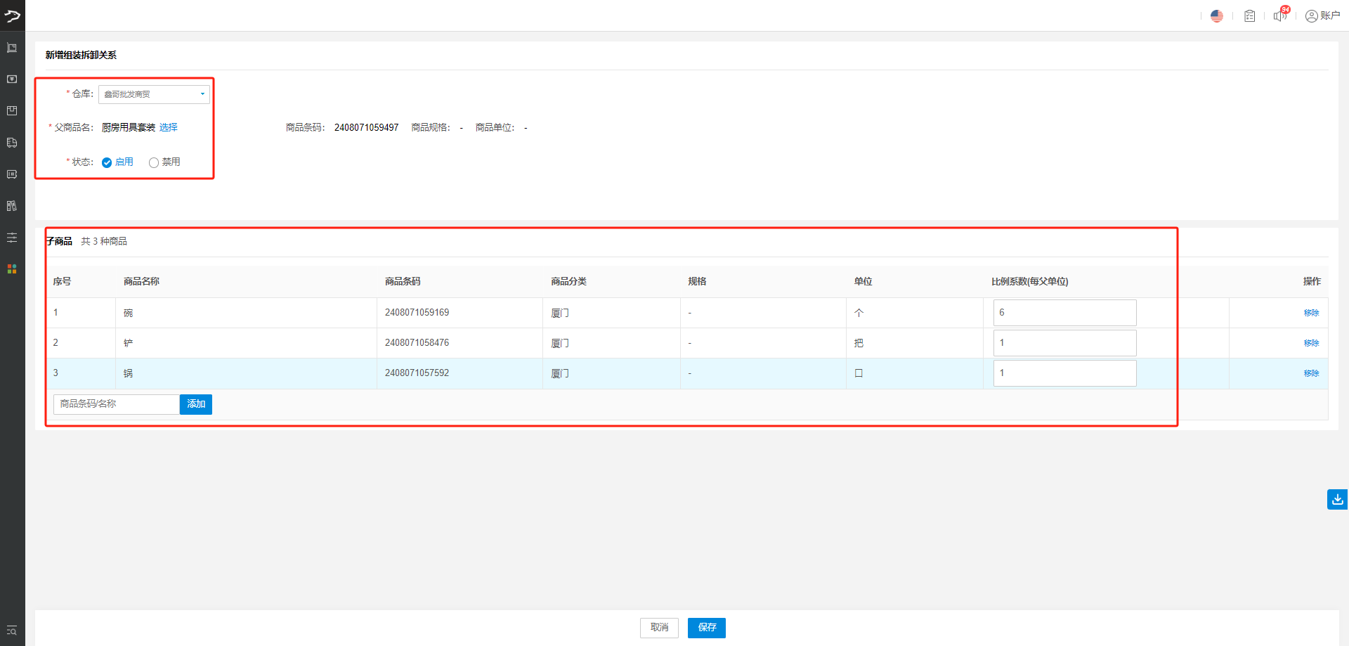 步骤:【库存】-【组装拆卸单】,在【组装拆卸设置】中设置组装拆卸规则,如厨房用具套装由锅*1、铲*1、碗*6组合。