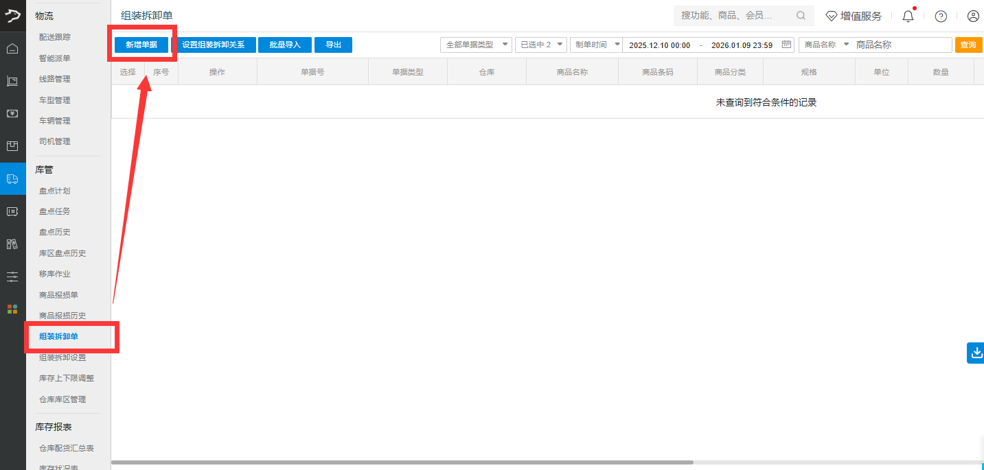 创建组装、拆卸单据,选择所涉及的商品。满足公司将商品零件或部件组合在一起或分解的场景。