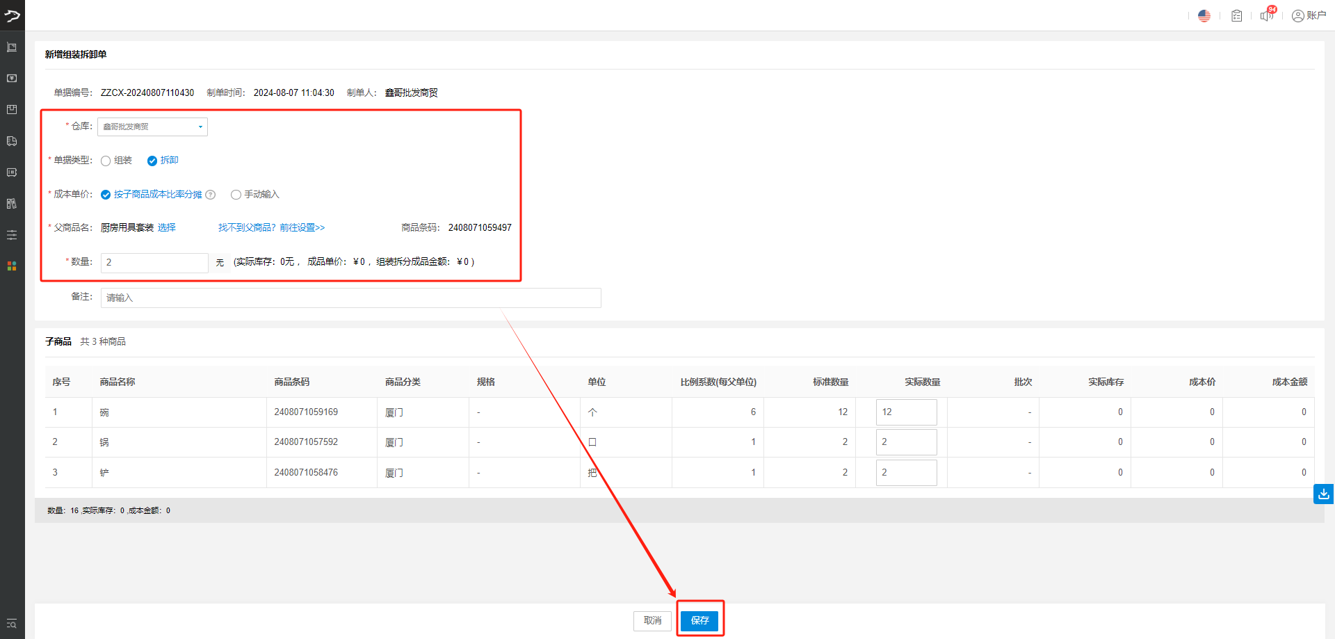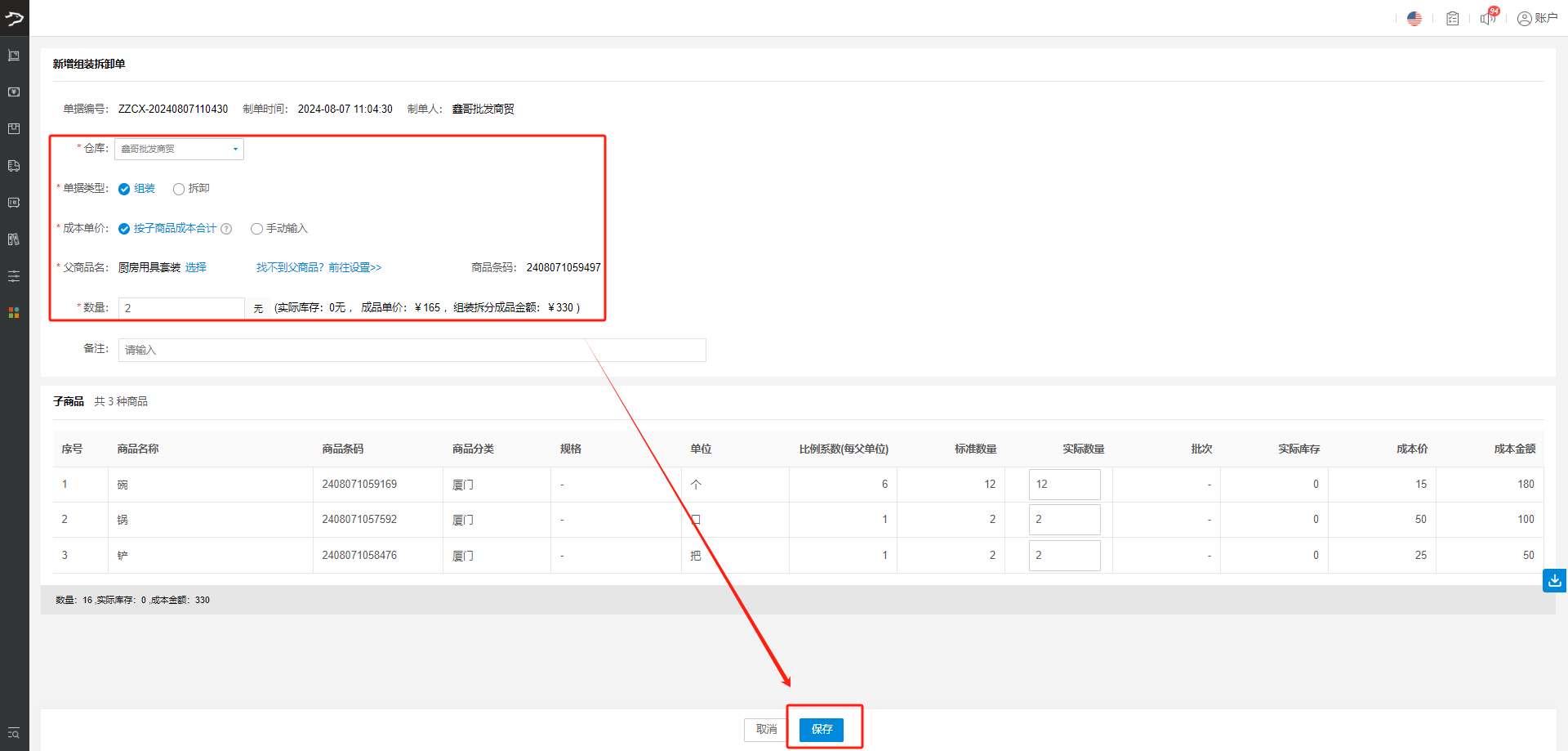 当您销售的是由多个小商品组合而成的套装时,只需在【组装拆卸单】中选择“组装”功能,轻松将多个单品组合成一个新的销售订单元。比如,将锅、铲、碗组合成“厨房用具套装”,一键完成,方便快捷。