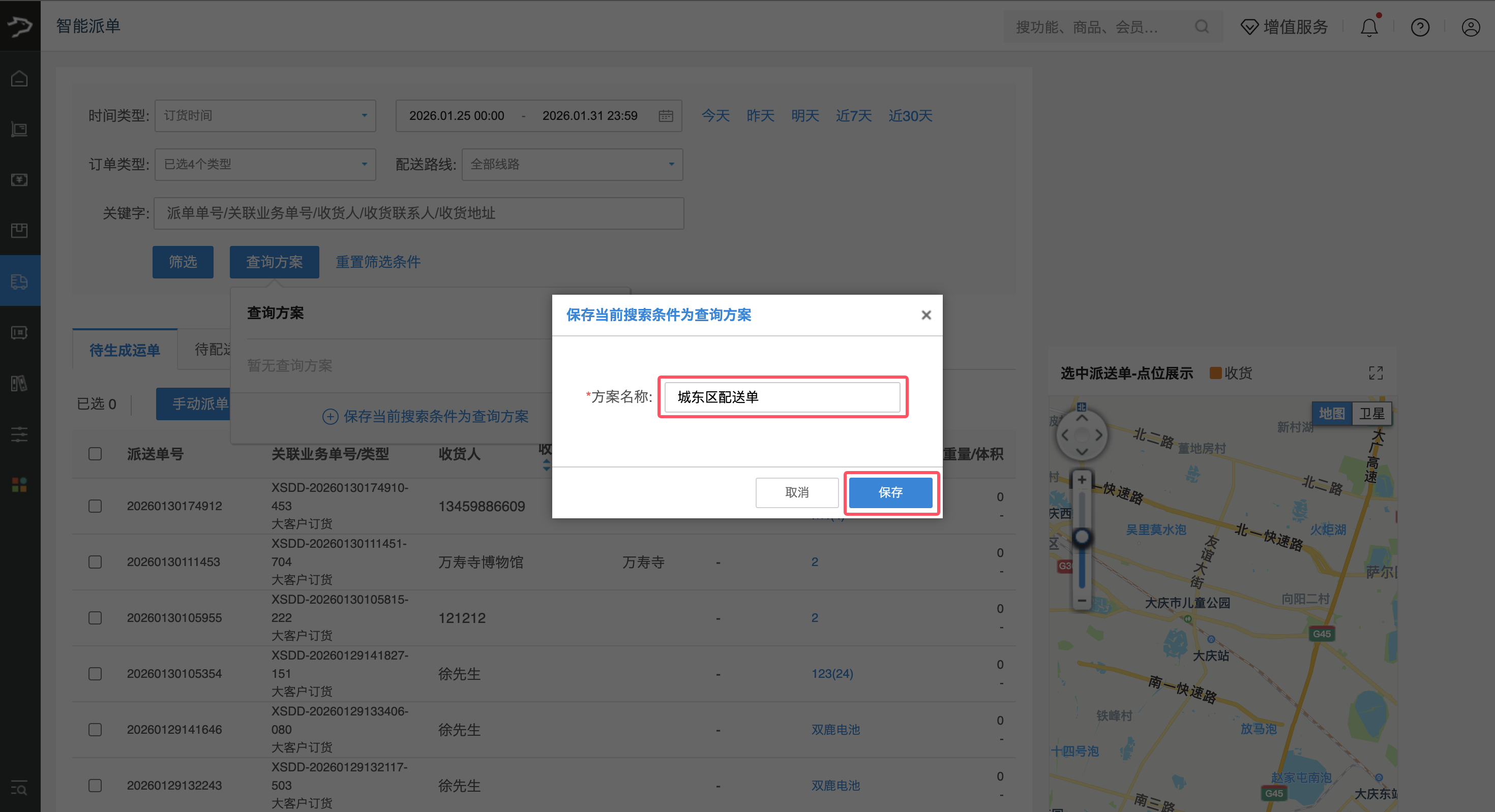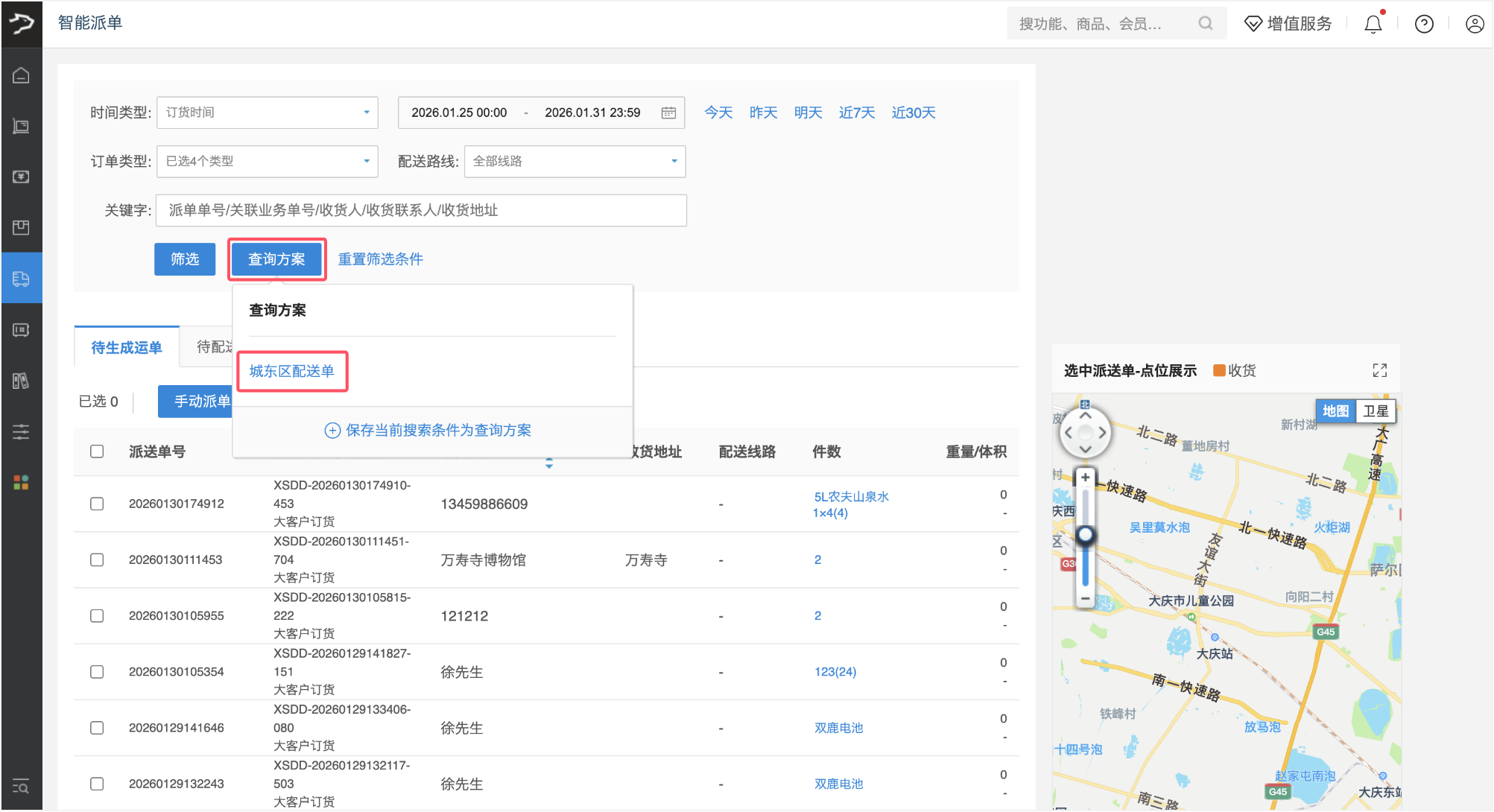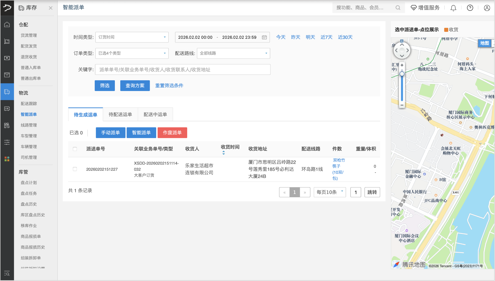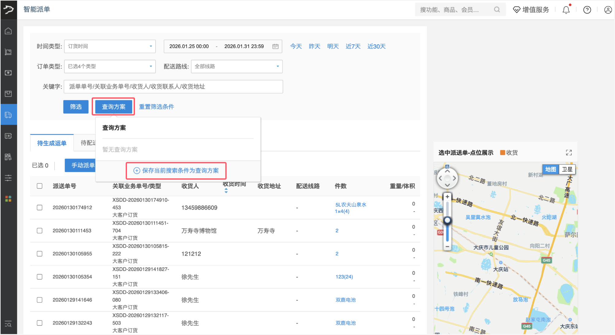 1、进入「智能派单」页面,可通过配置时间范围、订单类型、配送路线等筛选条件,或输入派单单号、关联业务单号、收货人等关键字,点击【筛选】按钮,查询符合条件的运单。