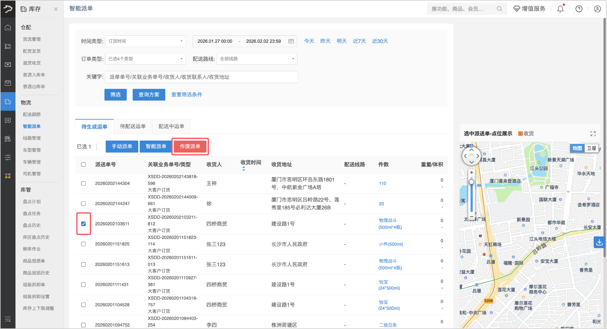 1、在「待生成运单」列表中勾选需作废的运单,点击页面上方【作废派单】按钮。