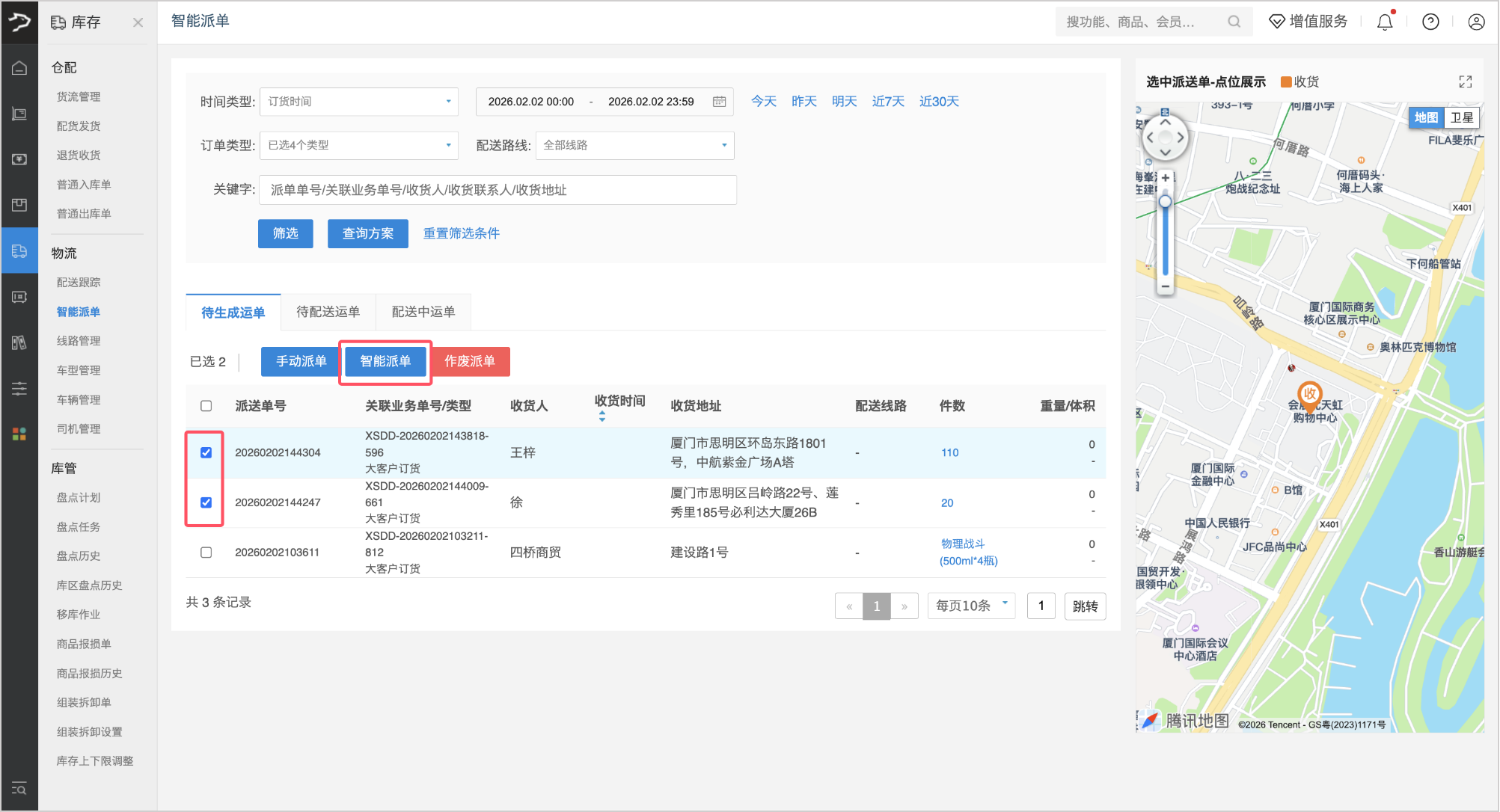 1、在「待生成运单」列表中,勾选需处理的订单,点击页面上方【智能派单】按钮。