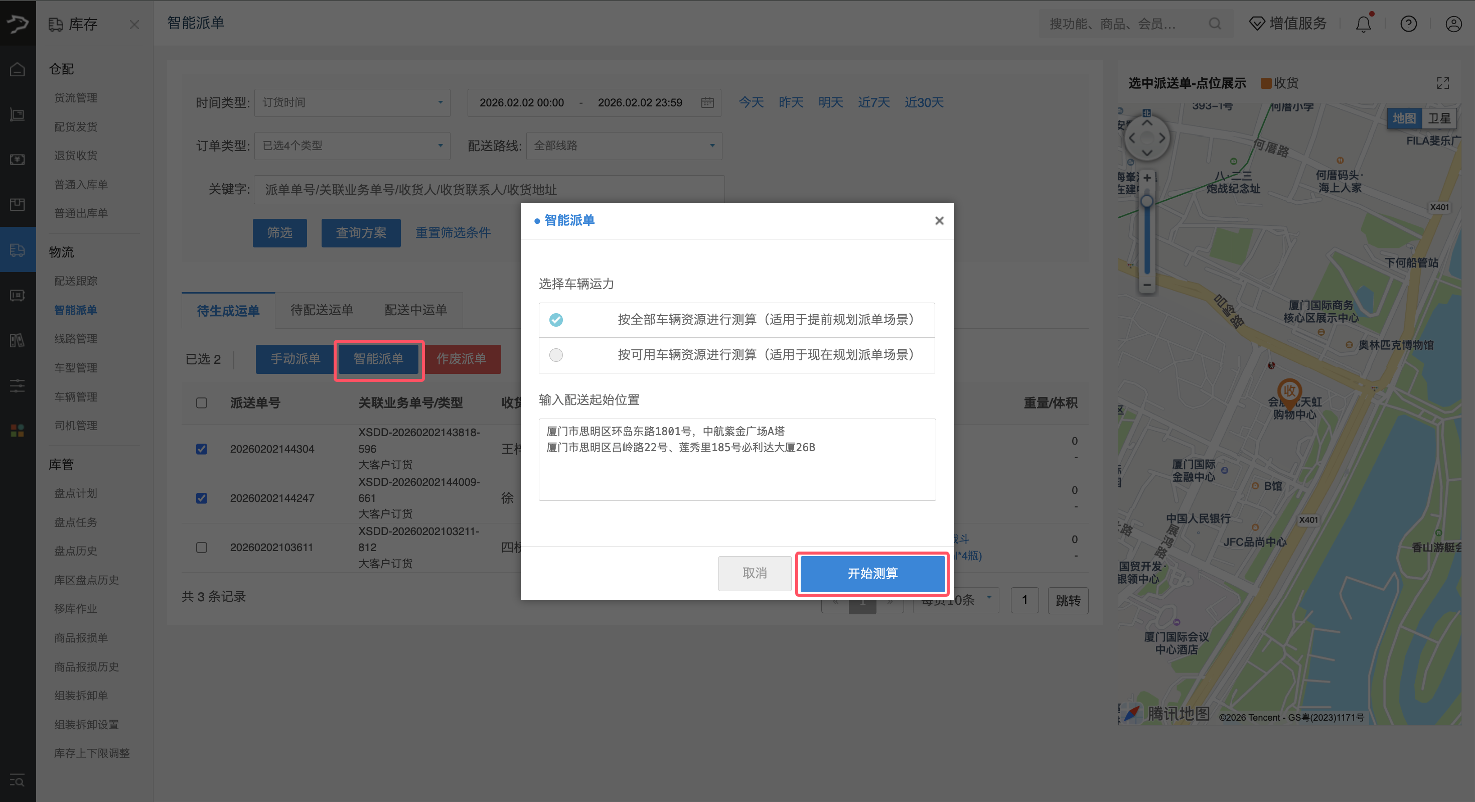 2、在弹出的配置窗口中,根据场景选择车辆资源测算方式(全部车辆资源 / 可用车辆资源),输入配送起始位置后,点击【开始测算】按钮。系统会自动将运单按地址聚类成派送组,并规划最优配送路线。