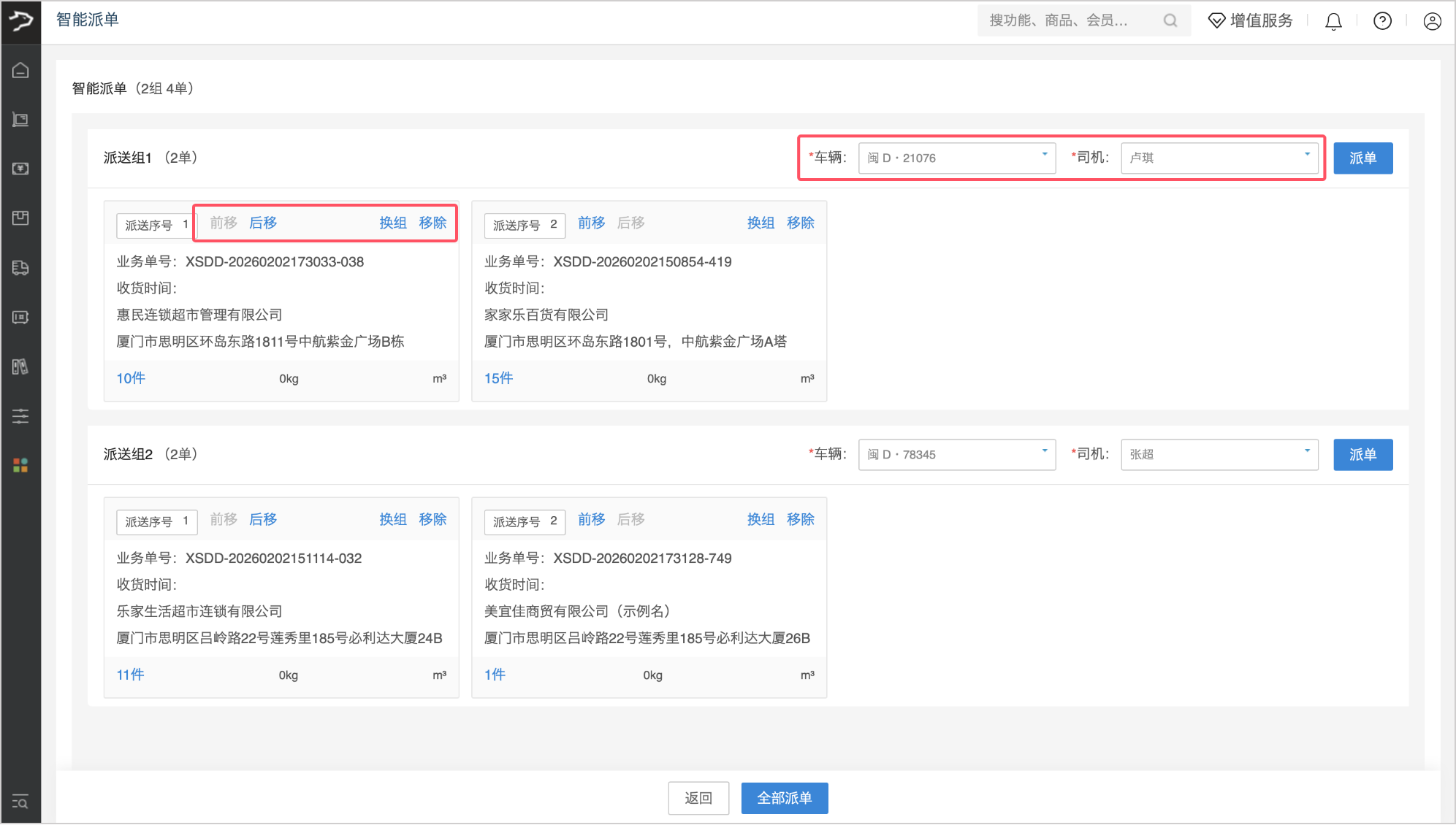 • 为每个派送组确认或修改指派的车辆与司机