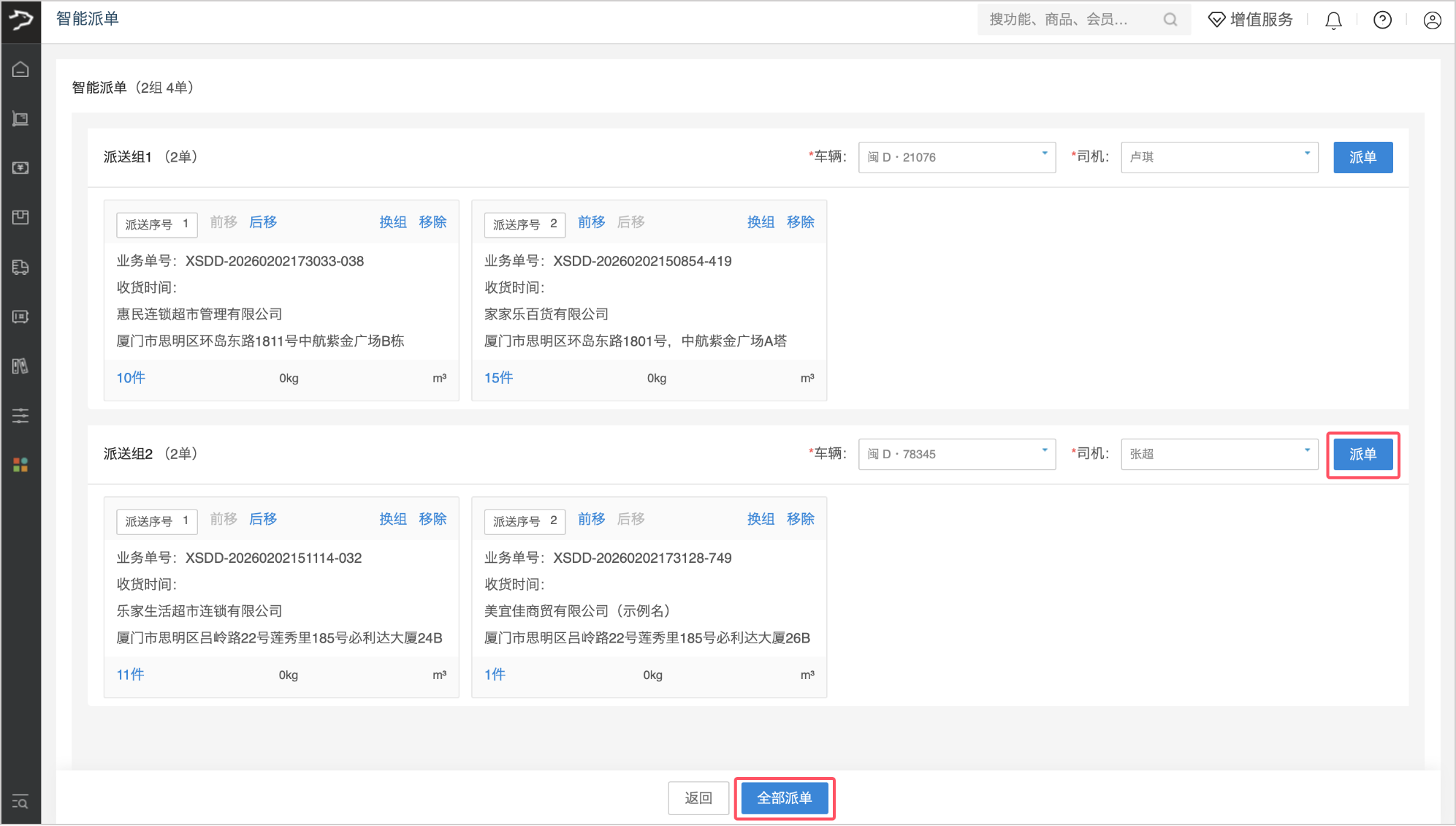 4、确认信息无误后,可选择点击单个派送组的【派单】按钮完成单组派单,或点击页面底部的【全部派单】按钮,一次性完成所有运单的调度。派单完成后,订单将自动转入「待配送运单」标签页。