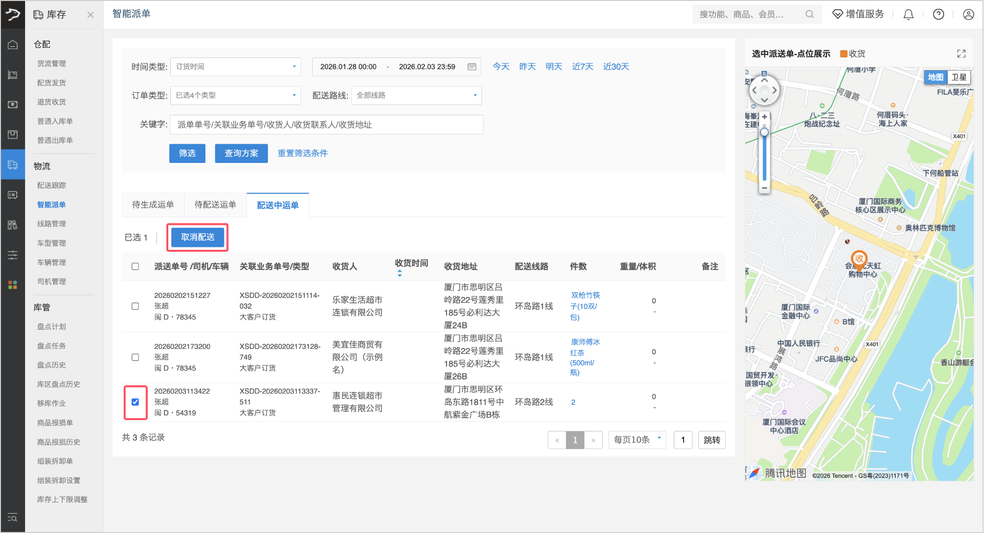 1、在「待配送运单」标签页,勾选需要取消的运单,点击页面上方【取消派单】按钮。