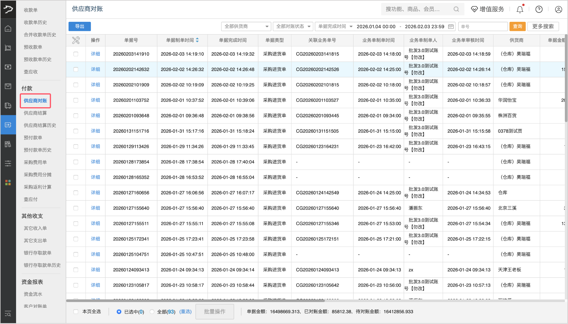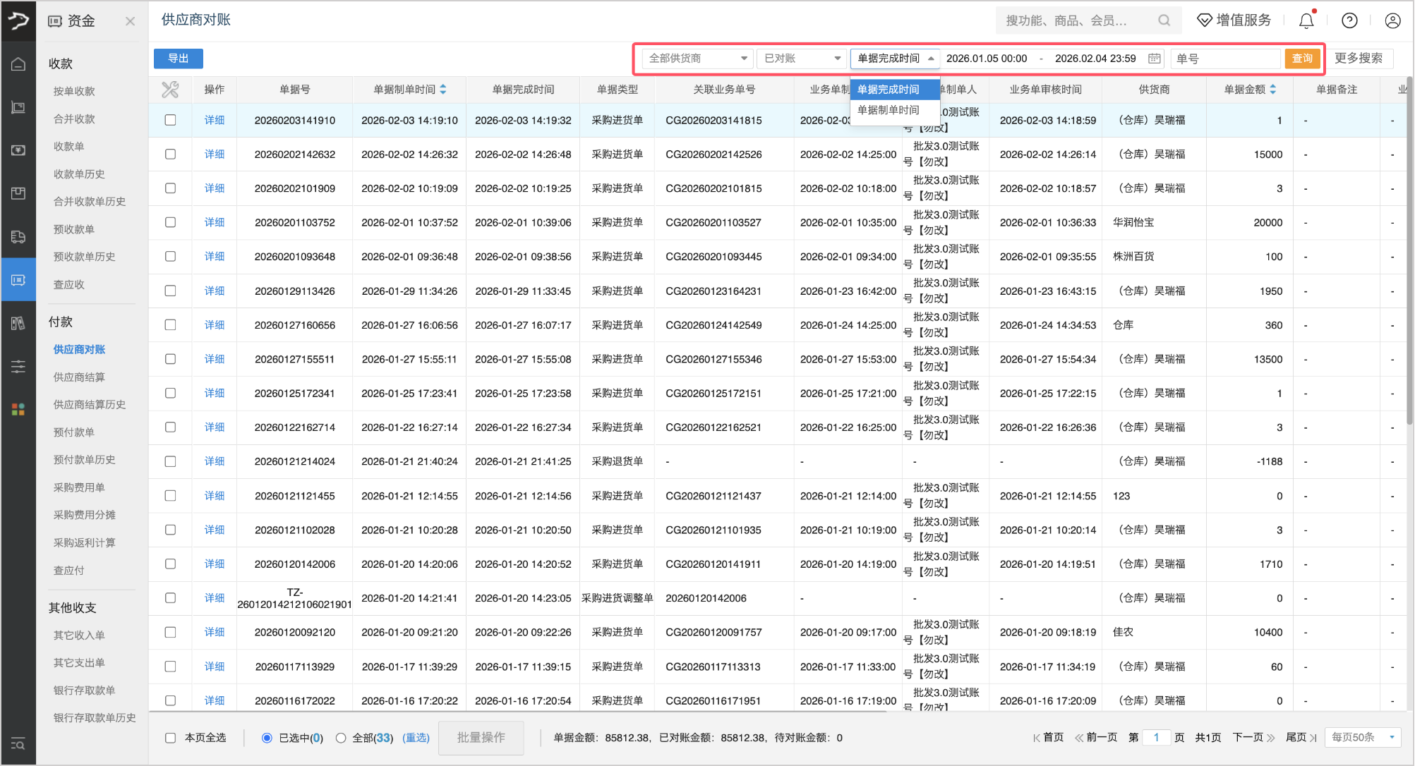 基础查询:支持按供应商、对账状态(全部/待对账/已对账)、时间范围、单号等条件查询单据。