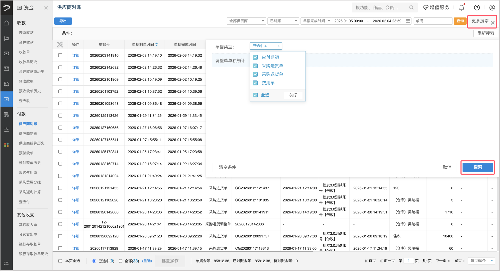 高级查询:支持按单据类型(应付期初 / 采购进货单 / 采购退货单 / 费用单 / 全选)、是否调整单单独统计,并结合基础筛选条件(时间范围、对账状态等)进行精准查询。